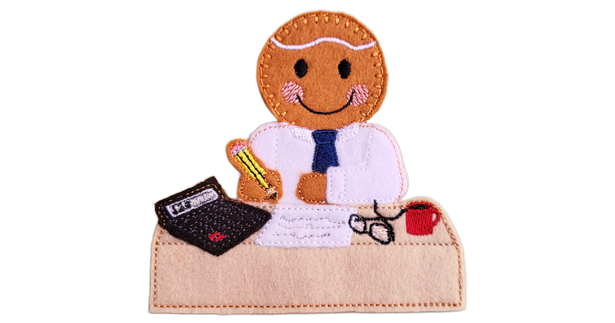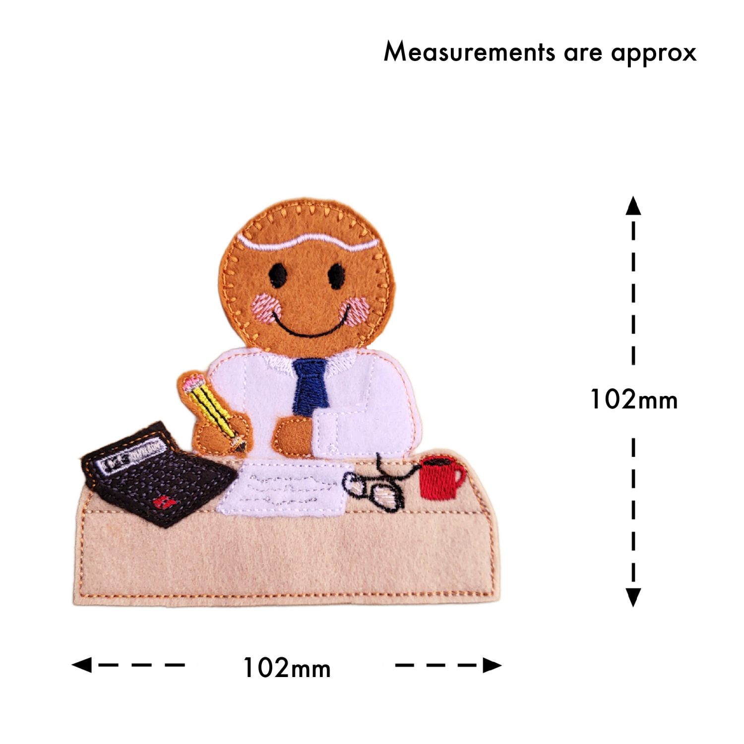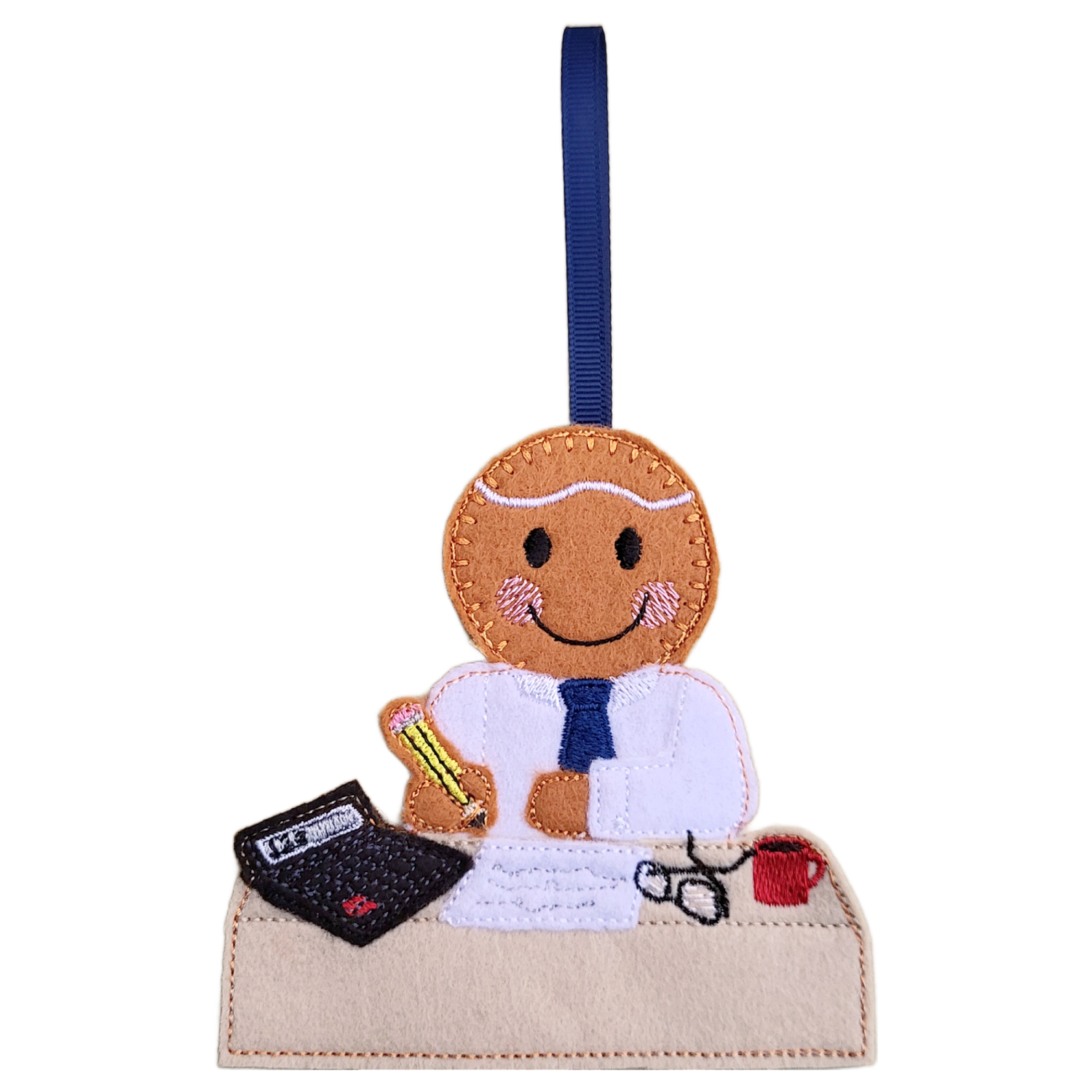Each gingerbread is made from soft felt and machine embroidered with premium threads for a neat, polished finish that still feels wonderfully handcrafted. Dressed in a crisp white shirt and smart tie, this cheerful character sits proudly at their desk with: