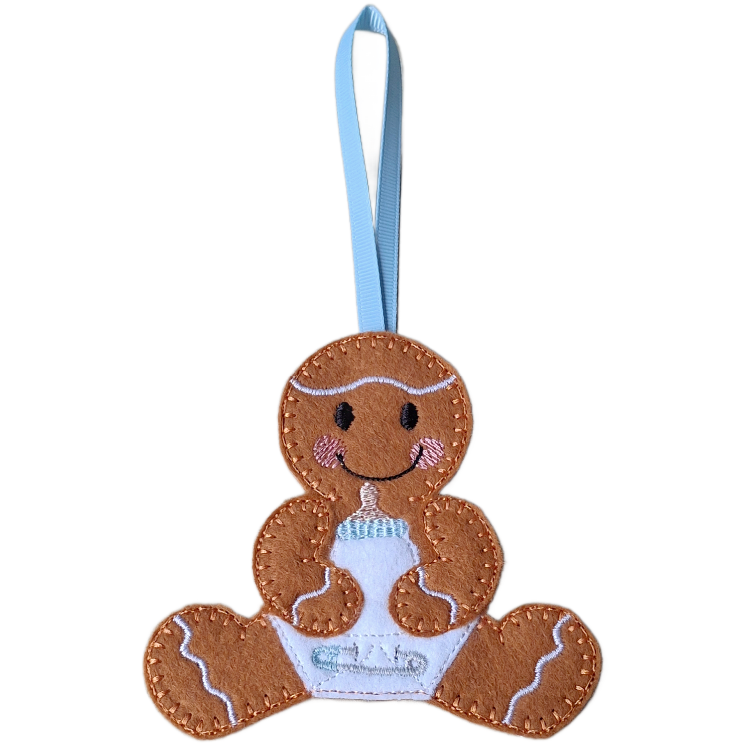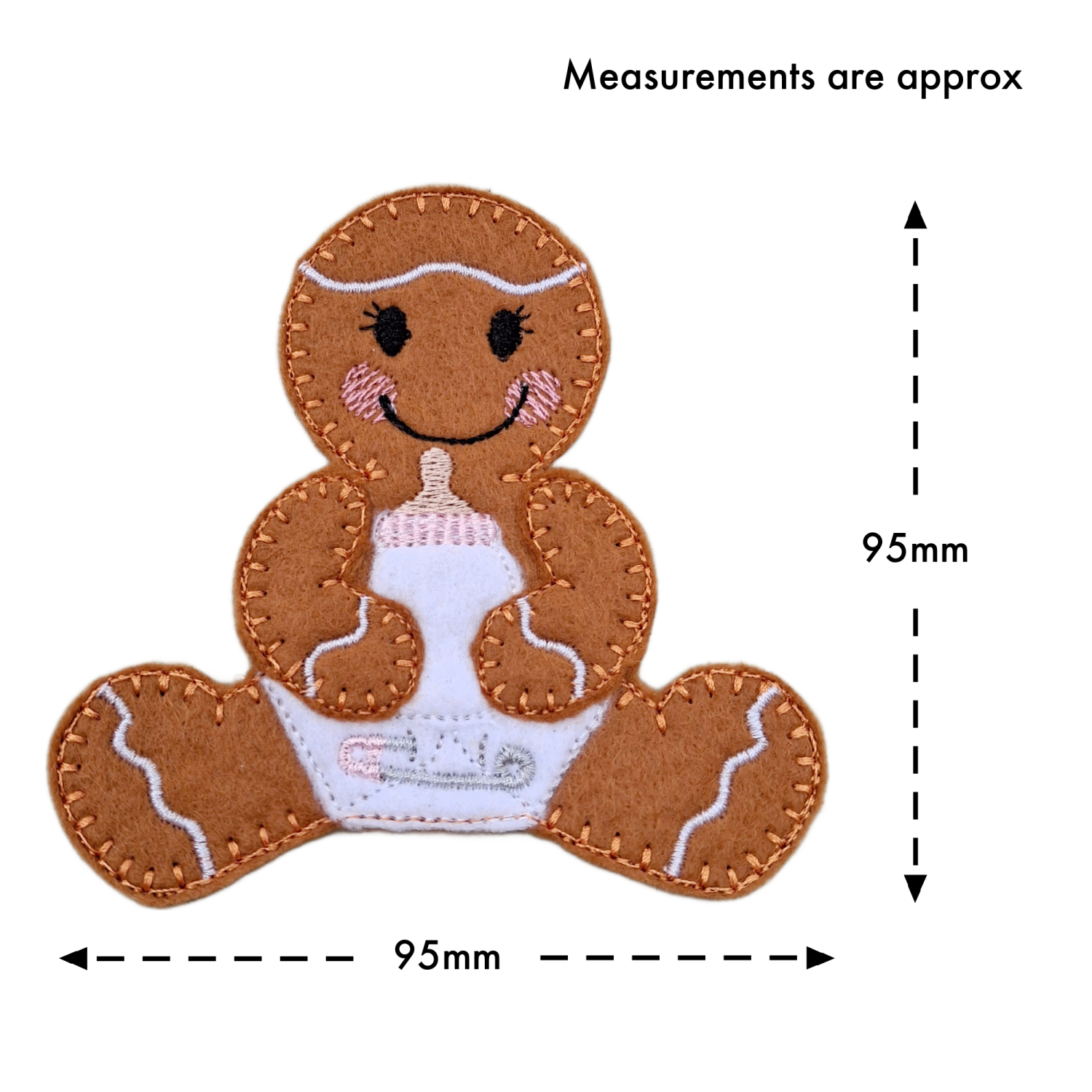 Handmade felt Gingerbread Baby Character sitting with a smile, dressed in a white nappy with a stitched pink safety pin and holding a matching baby bottle. Handmade felt Gingerbread Baby Character sitting with a white felt nappy and pink bottle, shown with approximate measurements of 95mm tall and 95mm wide. Text on the image reads “Measurements are approx.” Handmade felt Gingerbread Baby Character hanging decoration with a blue ribbon loop. The baby gingerbread is holding a matching blue bottle and wearing a white nappy with a blue embroidered safety pin.