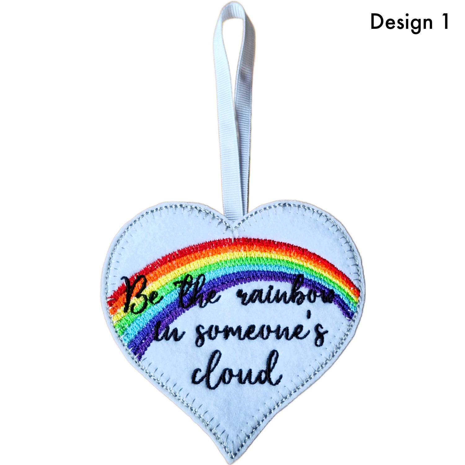 Each heart is crafted from soft felt and delicately machine embroidered using premium threads for a smooth, vibrant finish. The rainbow’s bright colours shine against the white felt, while the coordinating ribbon loop adds a clean, fresh touch that completes the design beautifully.