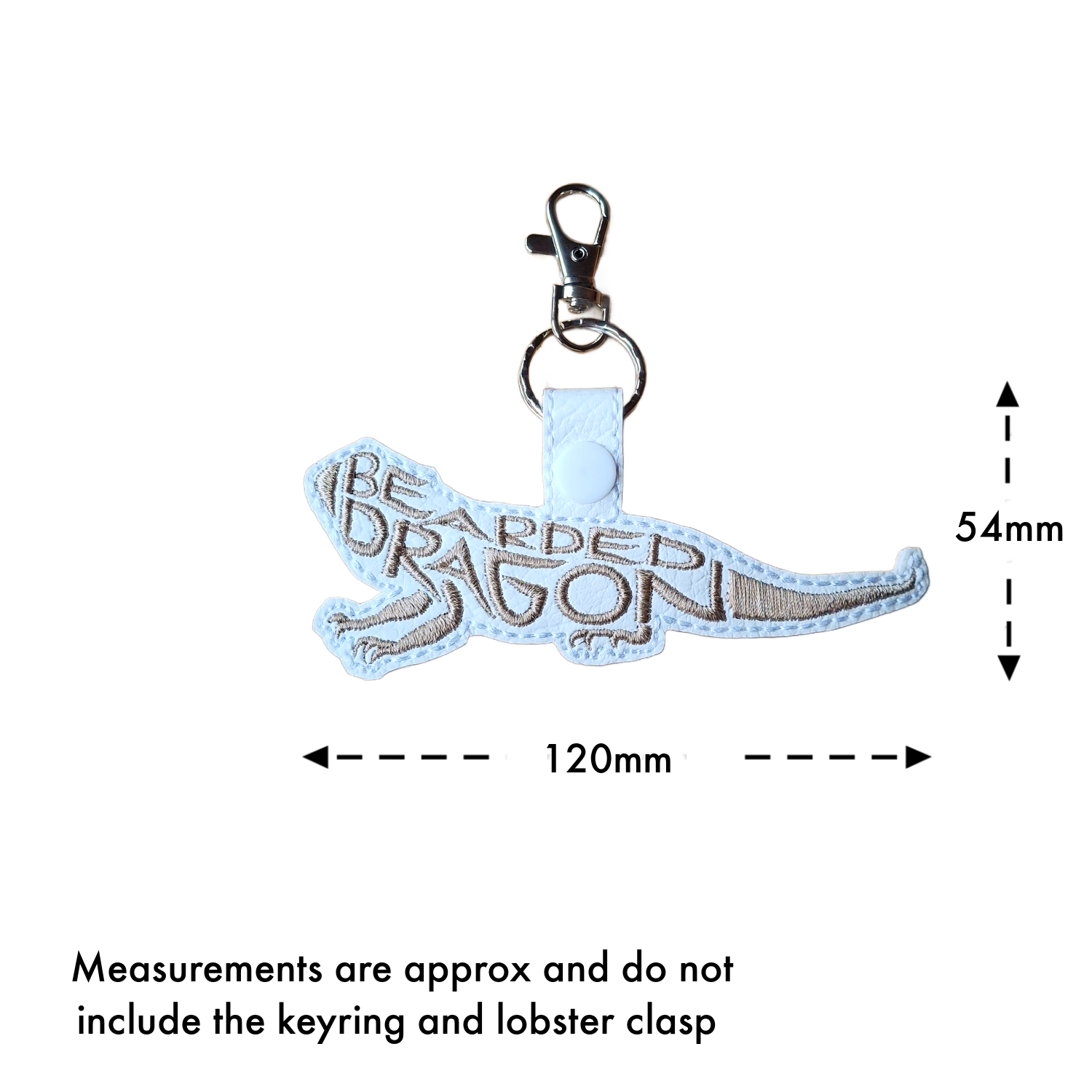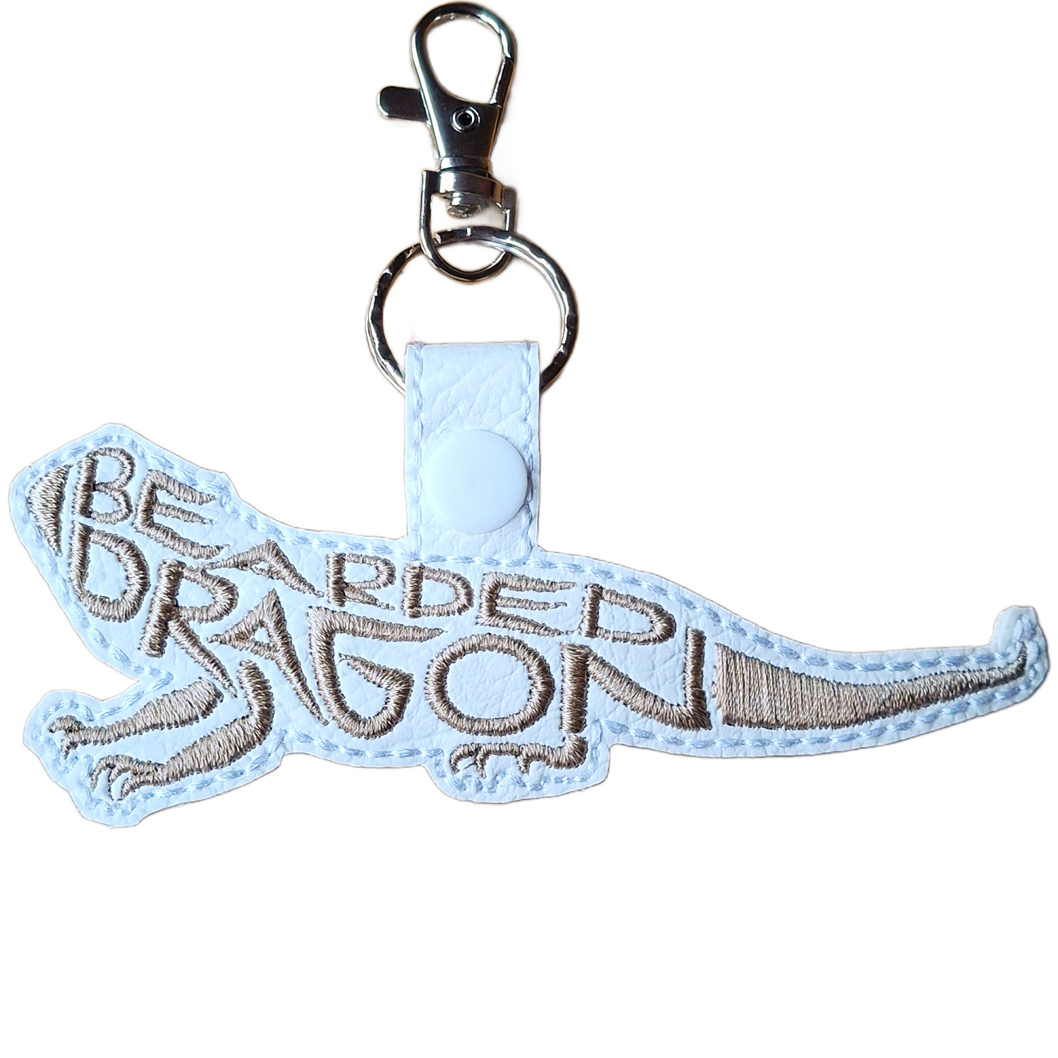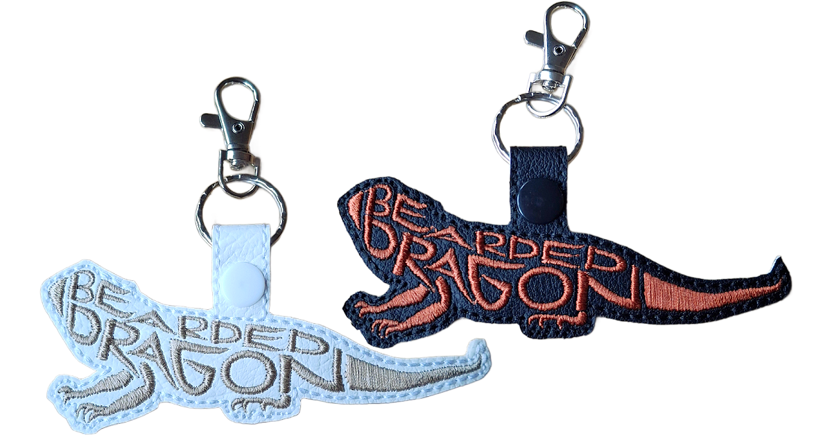 Made from soft faux leather and beautifully machine embroidered, each keyring captures the iconic shape of a bearded dragon with its textured scales and proud stance. The stitched word-art adds depth and interest, giving the piece a tactile finish while keeping it wonderfully lightweight.