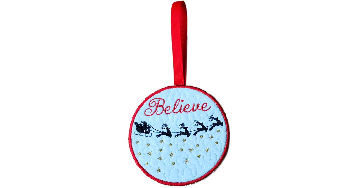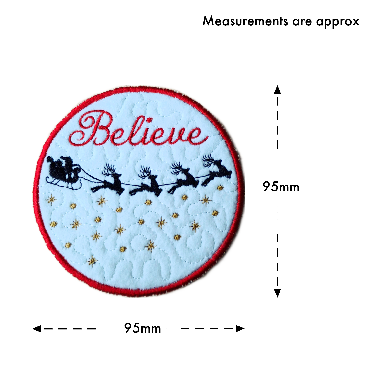 Round handmade felt Christmas ornament featuring Santa’s sleigh and reindeer flying across a starlit sky, embroidered with the word ‘Believe’ and finished with a red ribbon for hanging. Round felt Christmas ornament embroidered with Santa’s sleigh and the word ‘Believe’, showing approximate measurements of 95mm by 95mm.