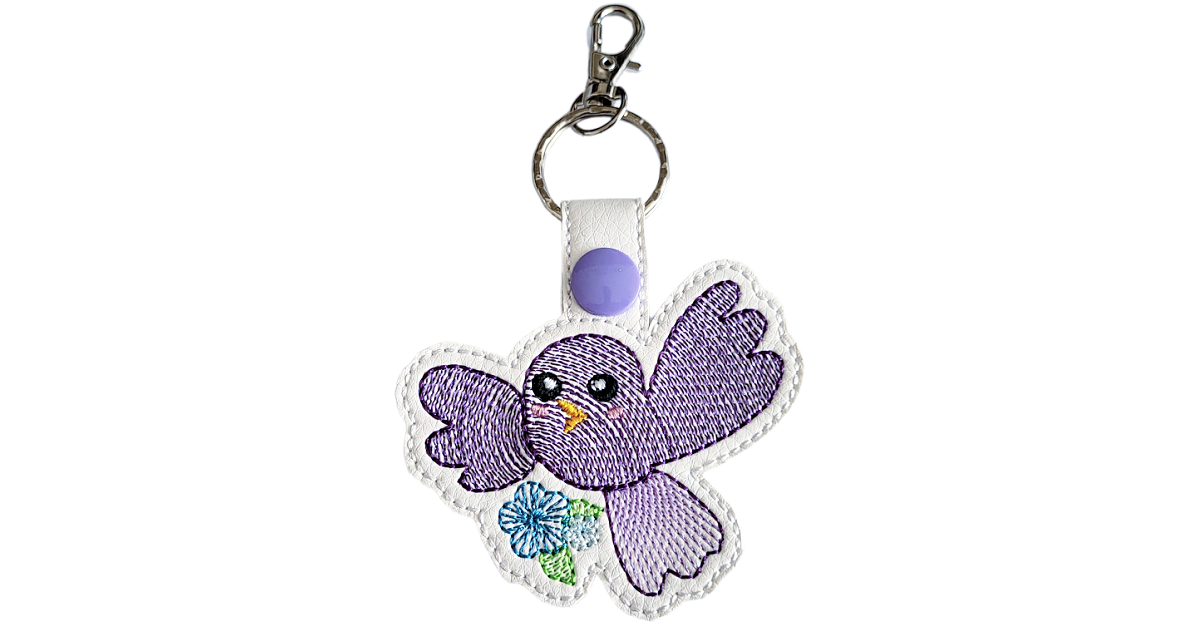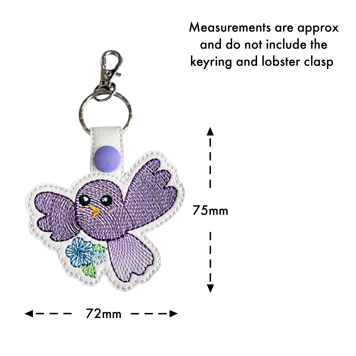Cheerful Chirpy Bird Keyring in white faux leather with purple embroidery, showing a kawaii-style bird with outstretched wings holding a small blue and green flower, attached to a silver keyring and lobster clasp. Cheerful Chirpy Bird Keyring in white faux leather with purple embroidery, showing a kawaii-style bird with outstretched wings holding a small blue and green flower, attached to a silver keyring and lobster clasp. Approximate size 75mm by 72mm, not including keyring and clasp.