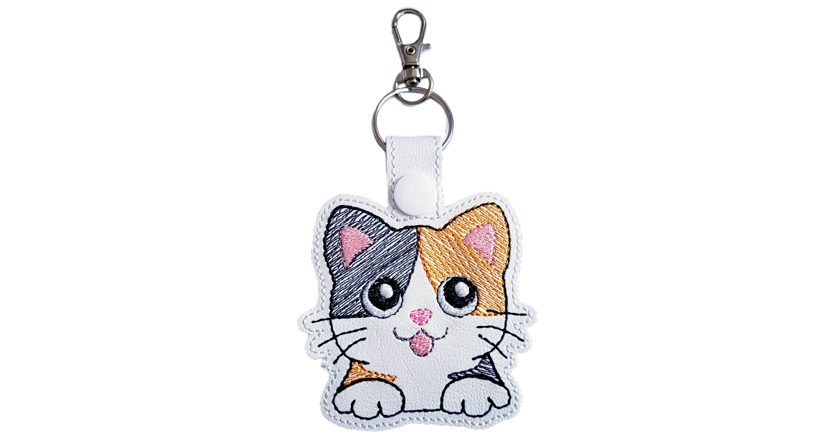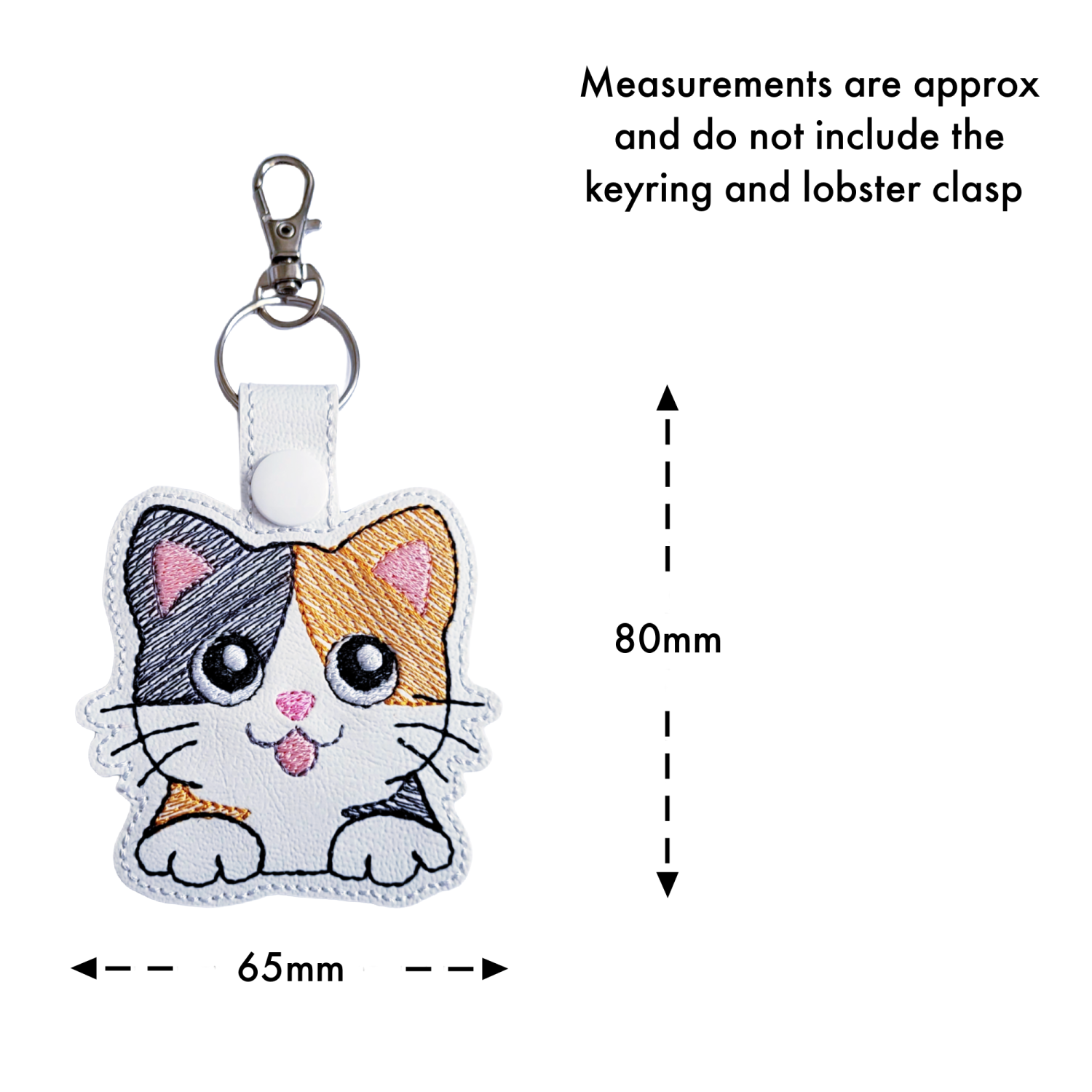 Made from soft faux leather and beautifully machine embroidered, each keyring captures the lovable charm of a calico cat – complete with its three-colour patchwork fur, dainty whiskers and sweet little paws. The stitching adds lovely depth and texture, giving the design a gentle handmade feel that stands out while remaining delightfully cute and full of kawaii personality.