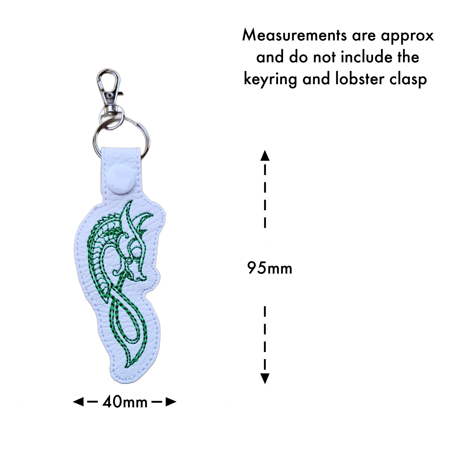 Two faux leather dragon-shaped keyrings featuring embroidered Celtic-inspired guardian dragon designs. One keyring is black with gold stitching, and the other is white with green stitching, each finished with a metal keyring and lobster clasp. Dragon-shaped faux leather keyring with an embroidered Celtic guardian dragon design, showing approximate measurements of 95 mm in height and 40 mm in width. Set of keys attached to a black faux leather dragon-shaped keyring featuring an embroidered Celtic guardian dragon design in gold stitching, secured with a metal keyring and lobster clasp. Black faux leather dragon-shaped keyring featuring an embroidered Celtic guardian dragon design in gold stitching, finished with a metal keyring and lobster clasp. White faux leather dragon-shaped keyring featuring an embroidered Celtic guardian dragon design in green stitching, finished with a metal keyring and lobster clasp.