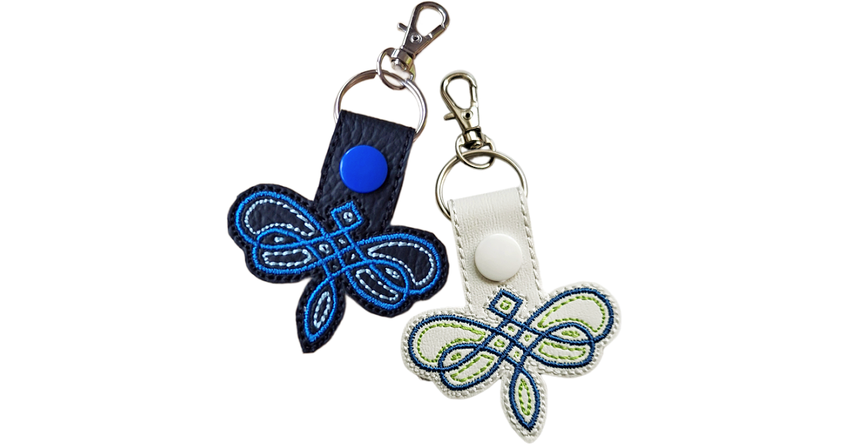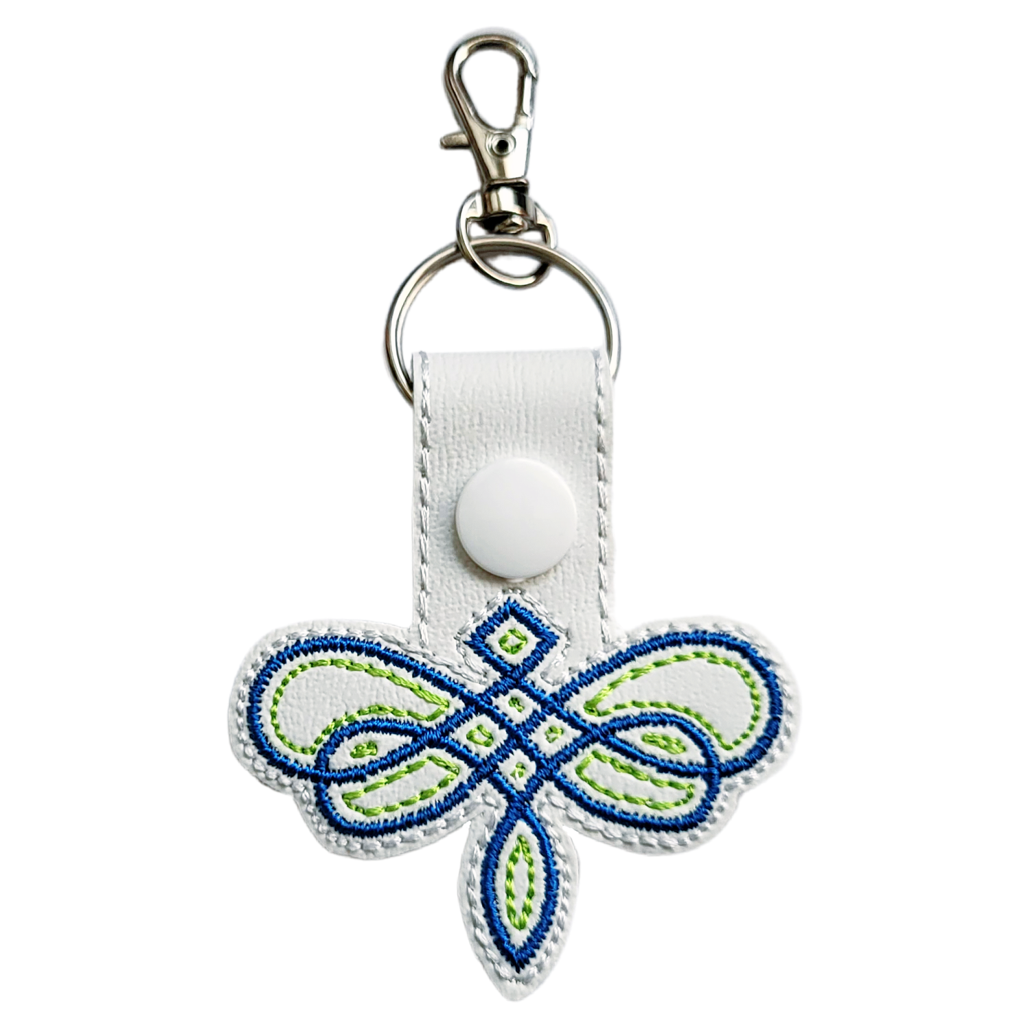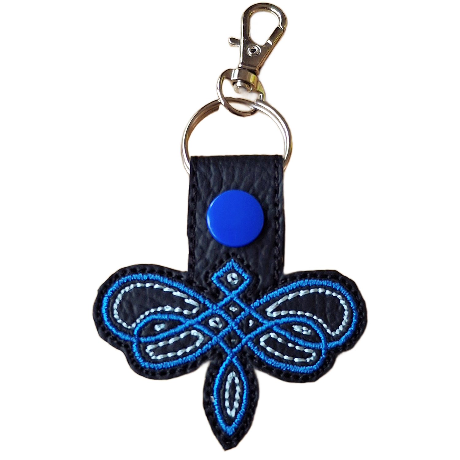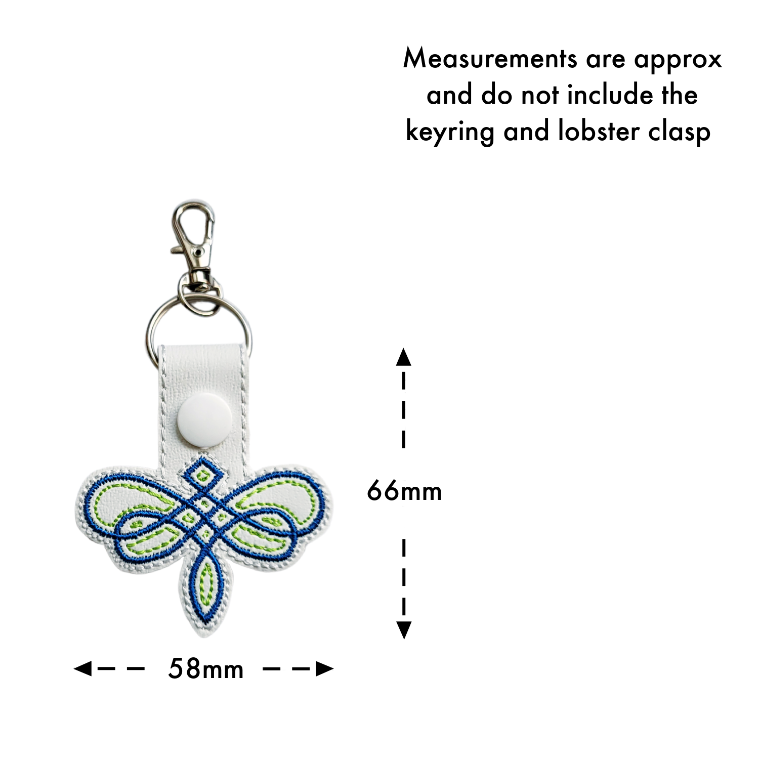 Two faux leather dragonfly keyrings with embroidered Celtic-style designs. One is black with blue stitching and a blue snap fastener; the other is white with green and blue stitching and a white snap fastener. Both have metal keyrings and lobster clasps. White faux leather dragonfly keyring with blue and green Celtic-style embroidery shown with measurements approximately 66 mm tall and 58 mm wide, excluding the keyring and clasp. Black faux leather dragonfly keyring with blue and light blue Celtic-style embroidery, finished with a blue snap fastener and a metal keyring and lobster clasp. White faux leather dragonfly keyring with blue and green Celtic-style embroidery, finished with a white snap fastener and a metal keyring and lobster clasp. White faux leather dragonfly keyring with teal and purple Celtic-style embroidery, finished with a white snap fastener and a metal keyring and lobster clasp.