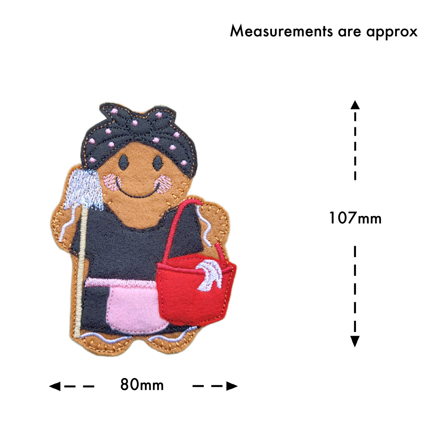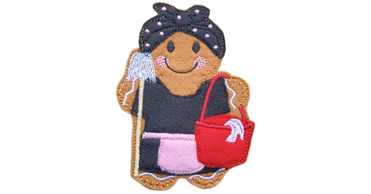 Each gingerbread character is carefully made from soft felt and machine embroidered using high-quality threads. From her neatly stitched outfit and patterned headscarf to the charming details on her mop and bucket, every element is created with patience and attention to detail, giving each piece its own gentle personality.