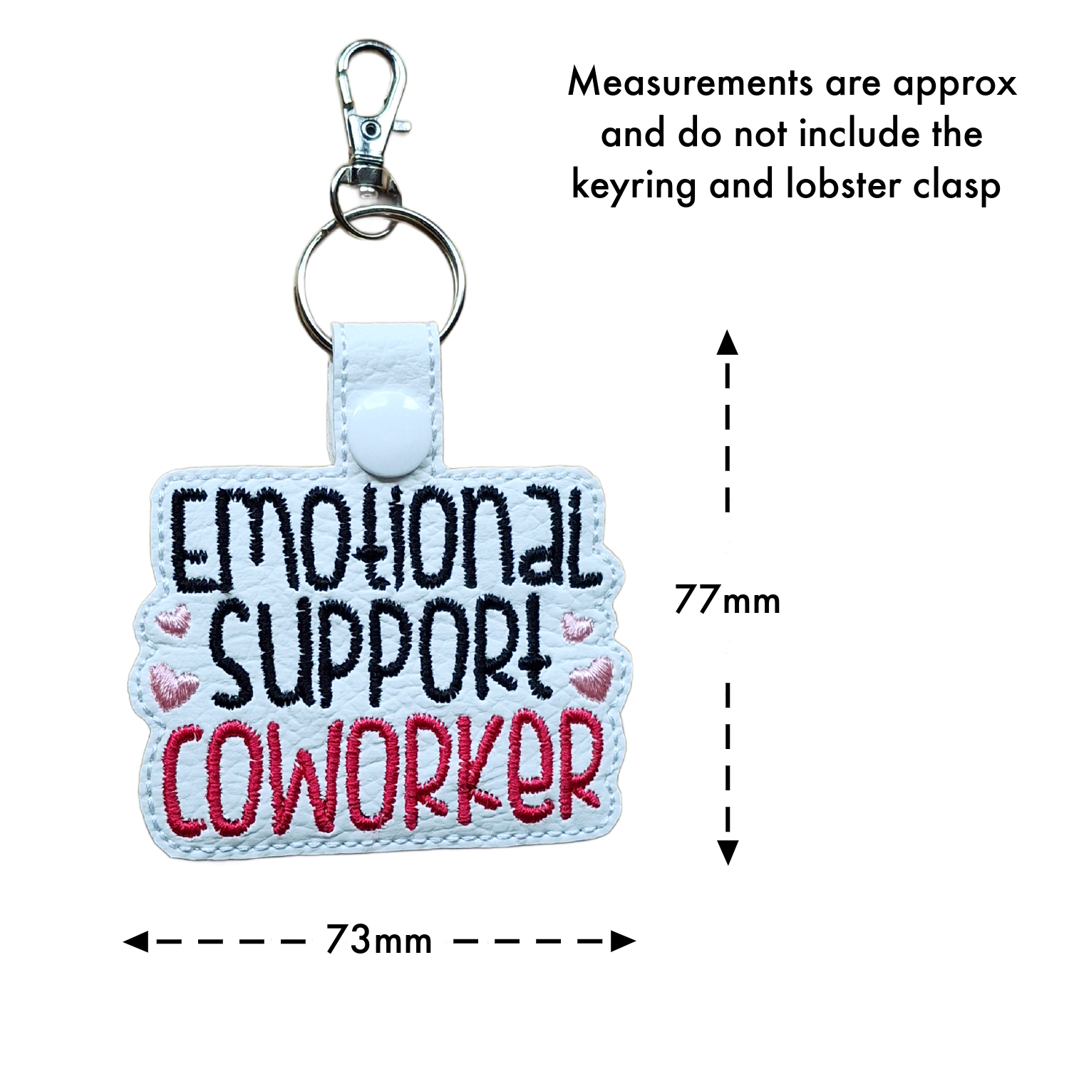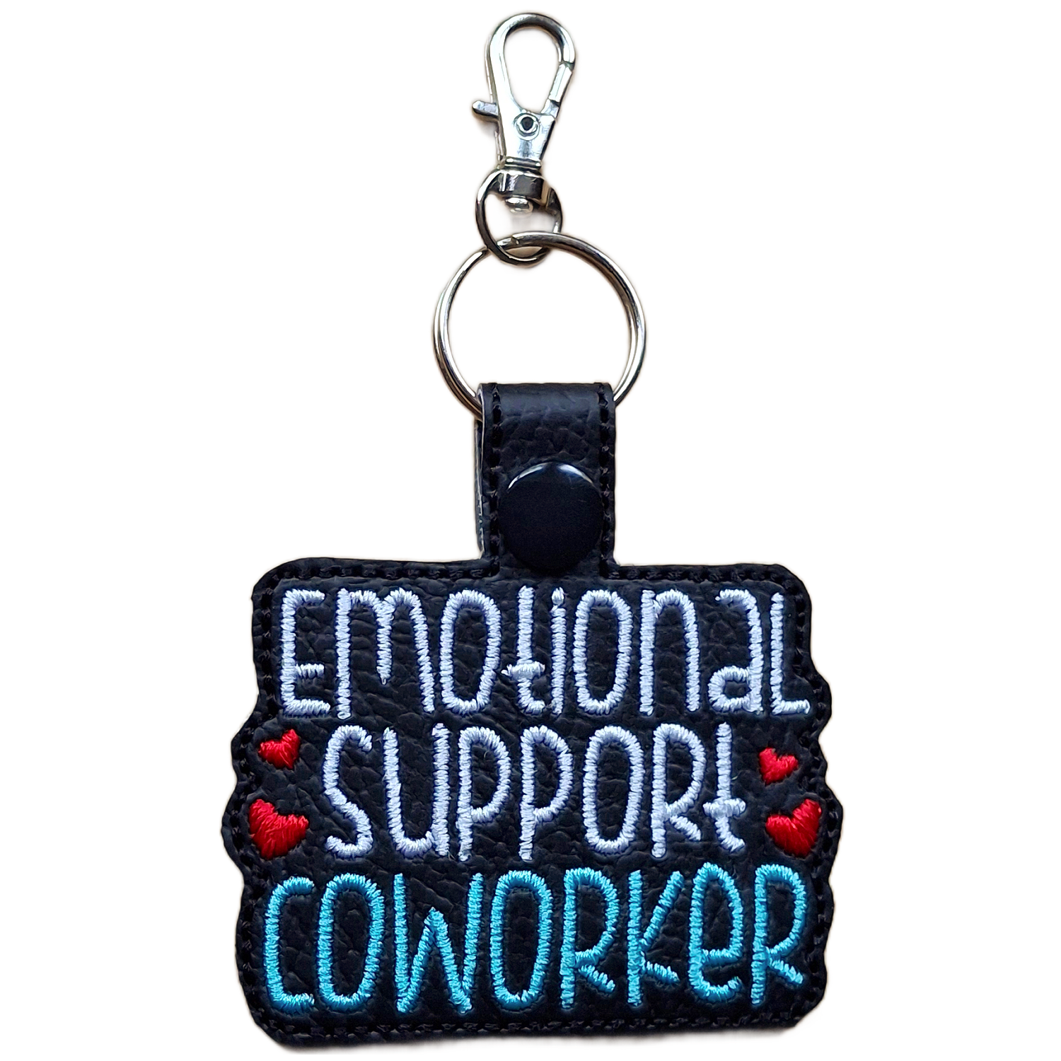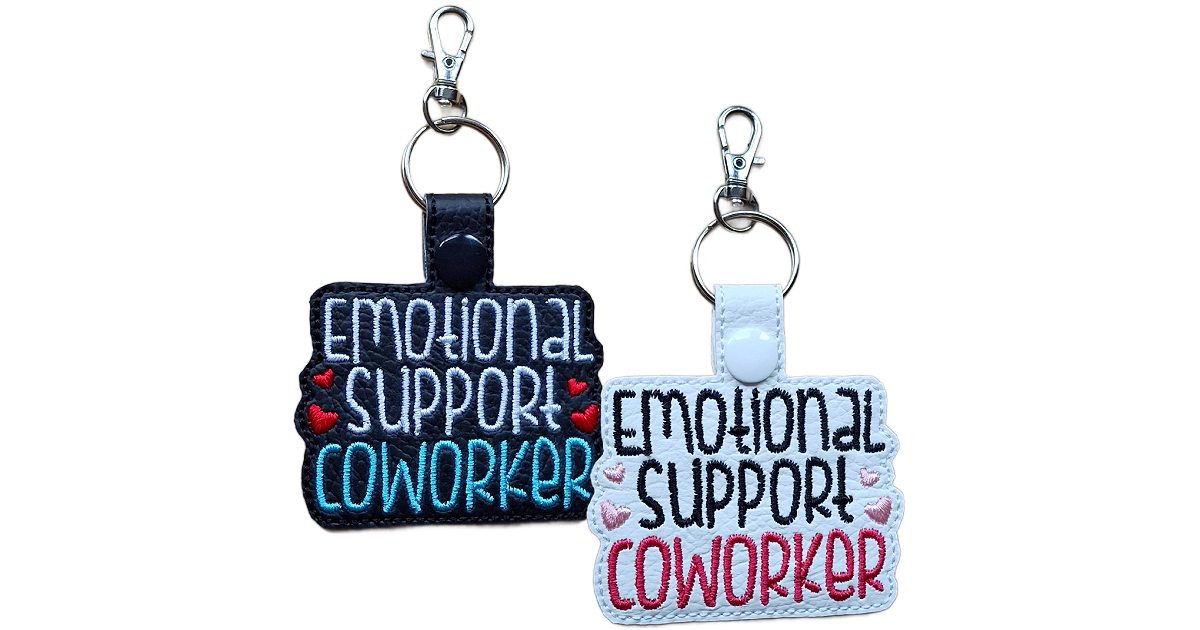 Each keyring is made from smooth faux leather and embroidered with crisp, colourful stitching. The words 'Emotional Support Coworker' are framed with little stitched hearts, giving it a sweet and expressive finish. The sturdy snap tab and metal clasp keep it securely attached to keys, bags, lanyards, or office totes.