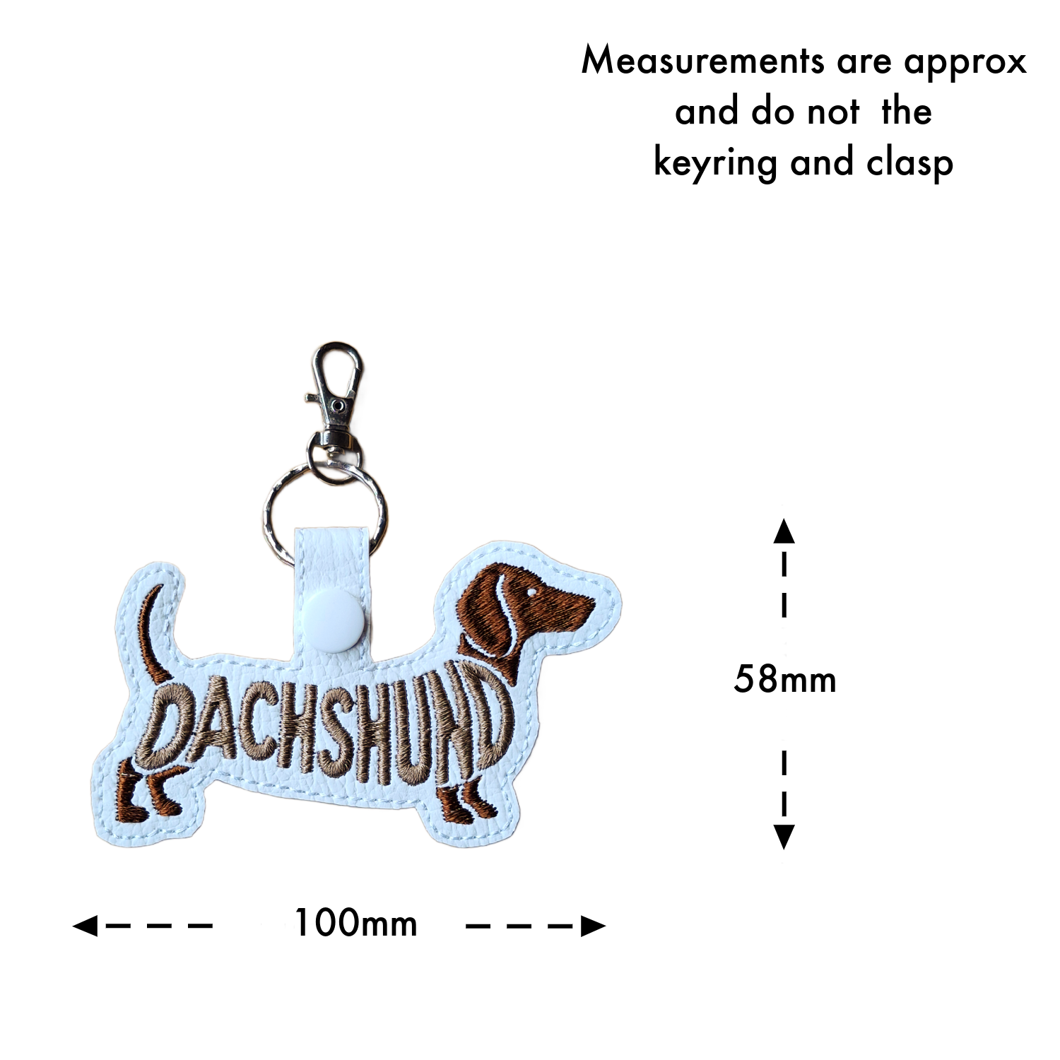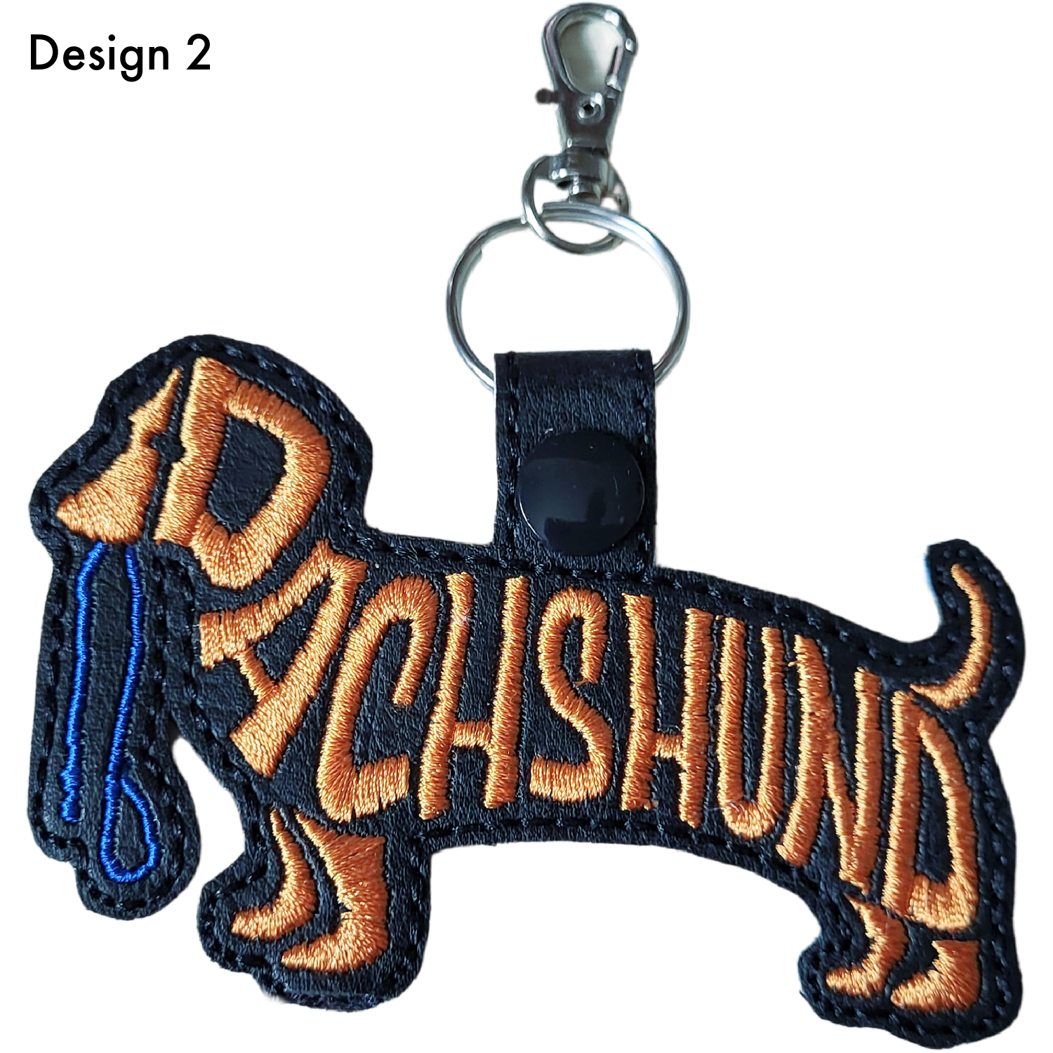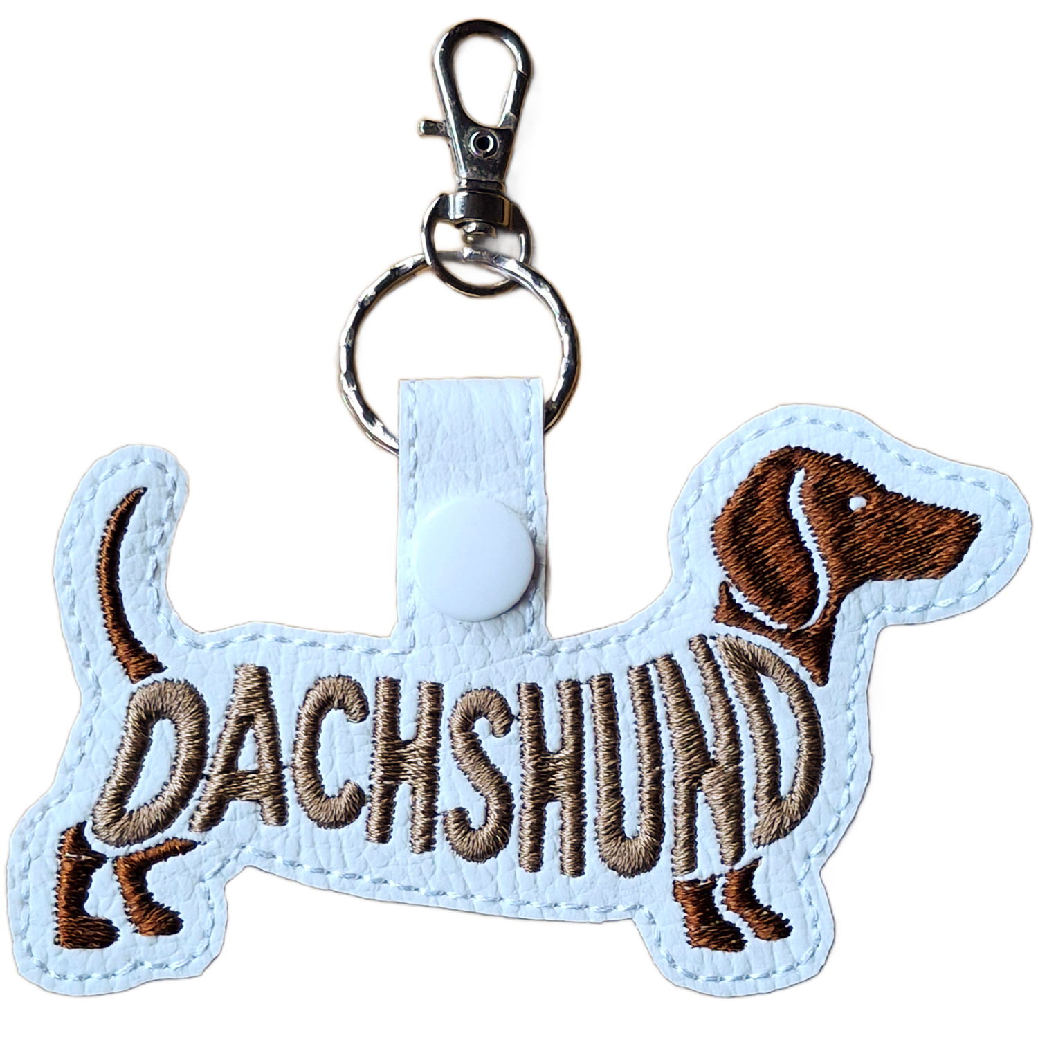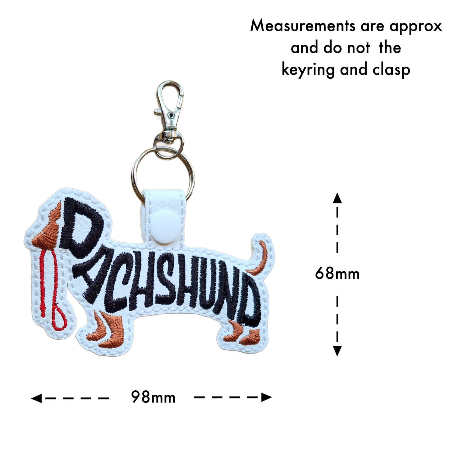 Each keyring is made from soft faux leather and finished with detailed machine embroidery using premium threads. The stitched word-art follows the Dachshund’s unique silhouette, adding texture, personality and charm without feeling fussy or overdone. Each piece is thoughtfully created to celebrate the character and cuteness of this beloved breed.