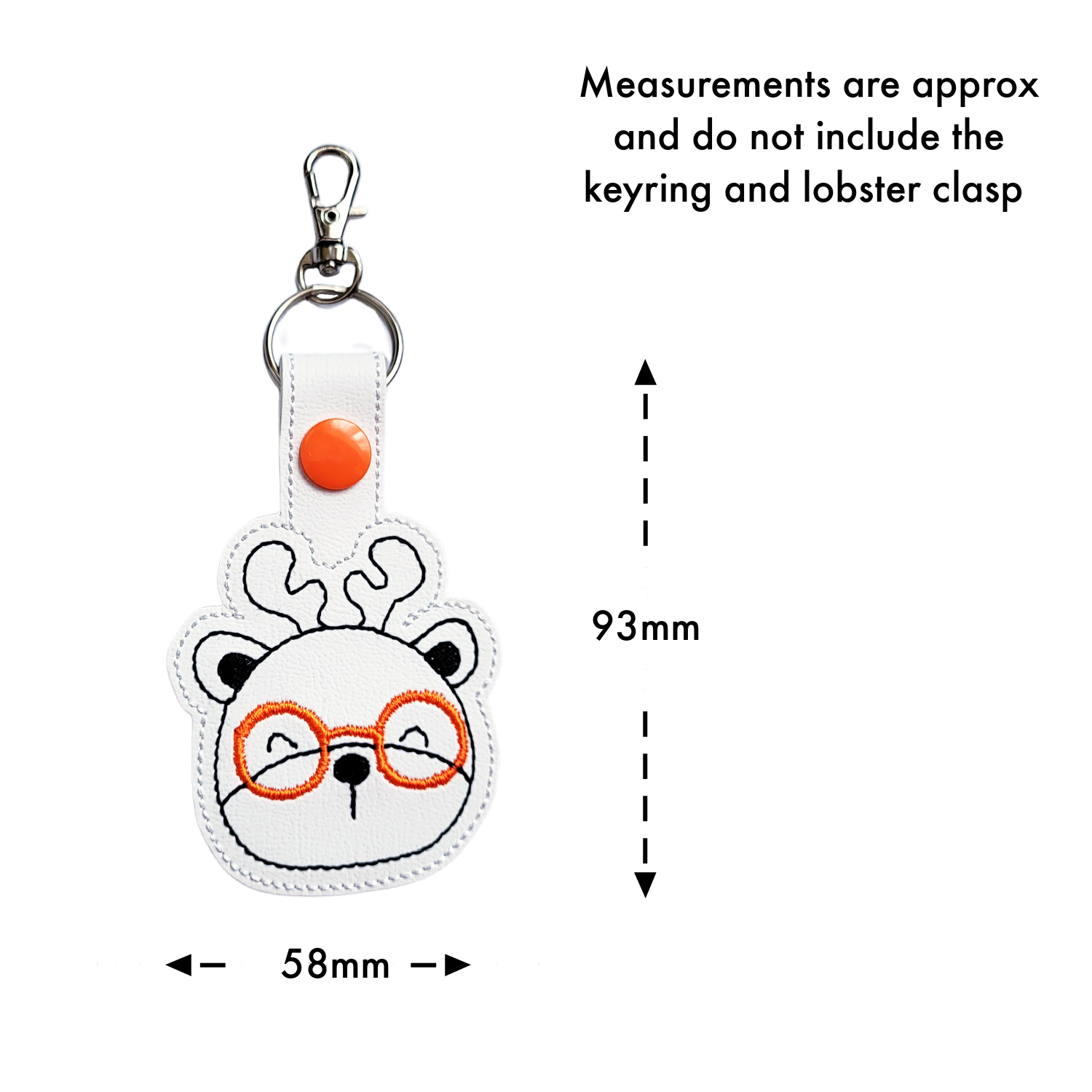 Crafted from soft, durable faux leather, this dreamy deer is machine embroidered using high-quality threads, giving every line a crisp, beautifully finished look. Cute stitched glasses and gentle facial details add a charming, storybook feel, while the secure snap-fastened tab attaches neatly to a sturdy keyring and clasp for easy clipping to bags, zips, and backpacks.