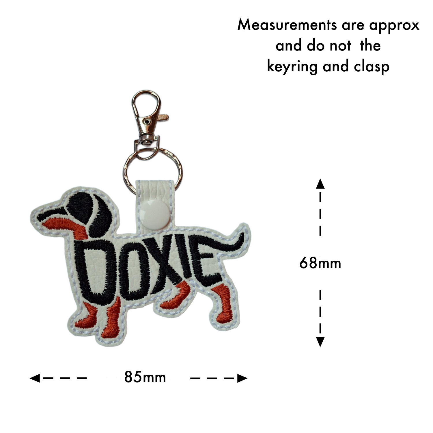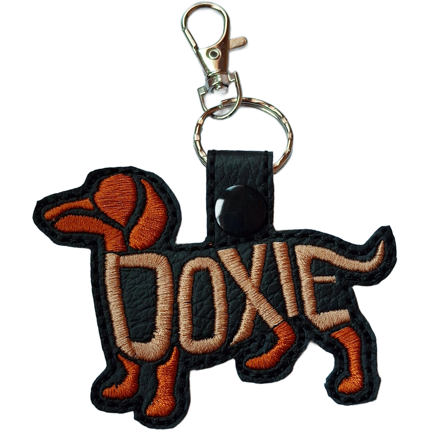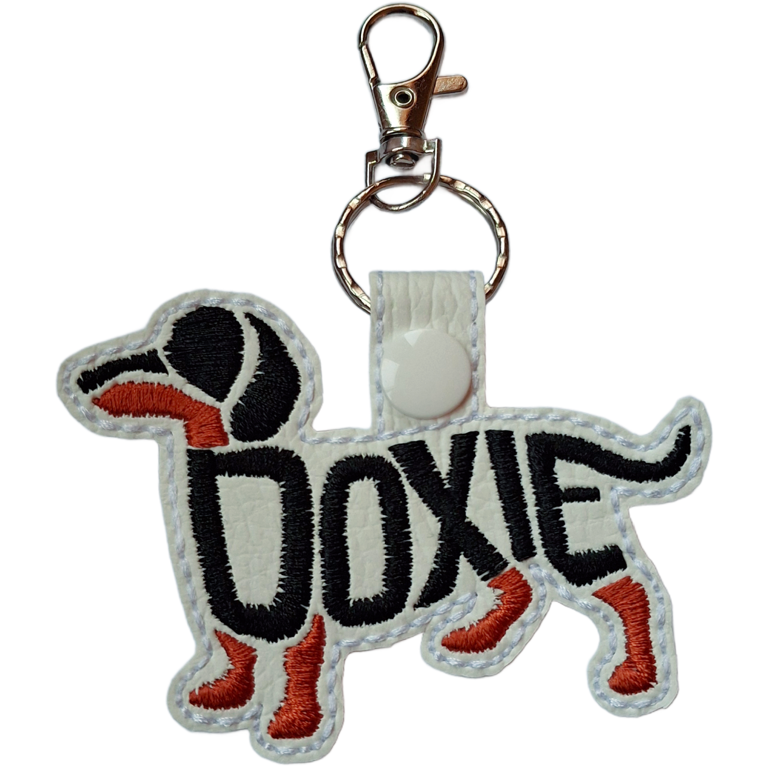 Made from smooth faux leather and neatly machine-embroidered with high-quality threads, each keyring captures the iconic silhouette of the dachshund. The stitched word-art adds texture and depth, giving the piece a tactile, characterful finish that stands out without being overly bold.