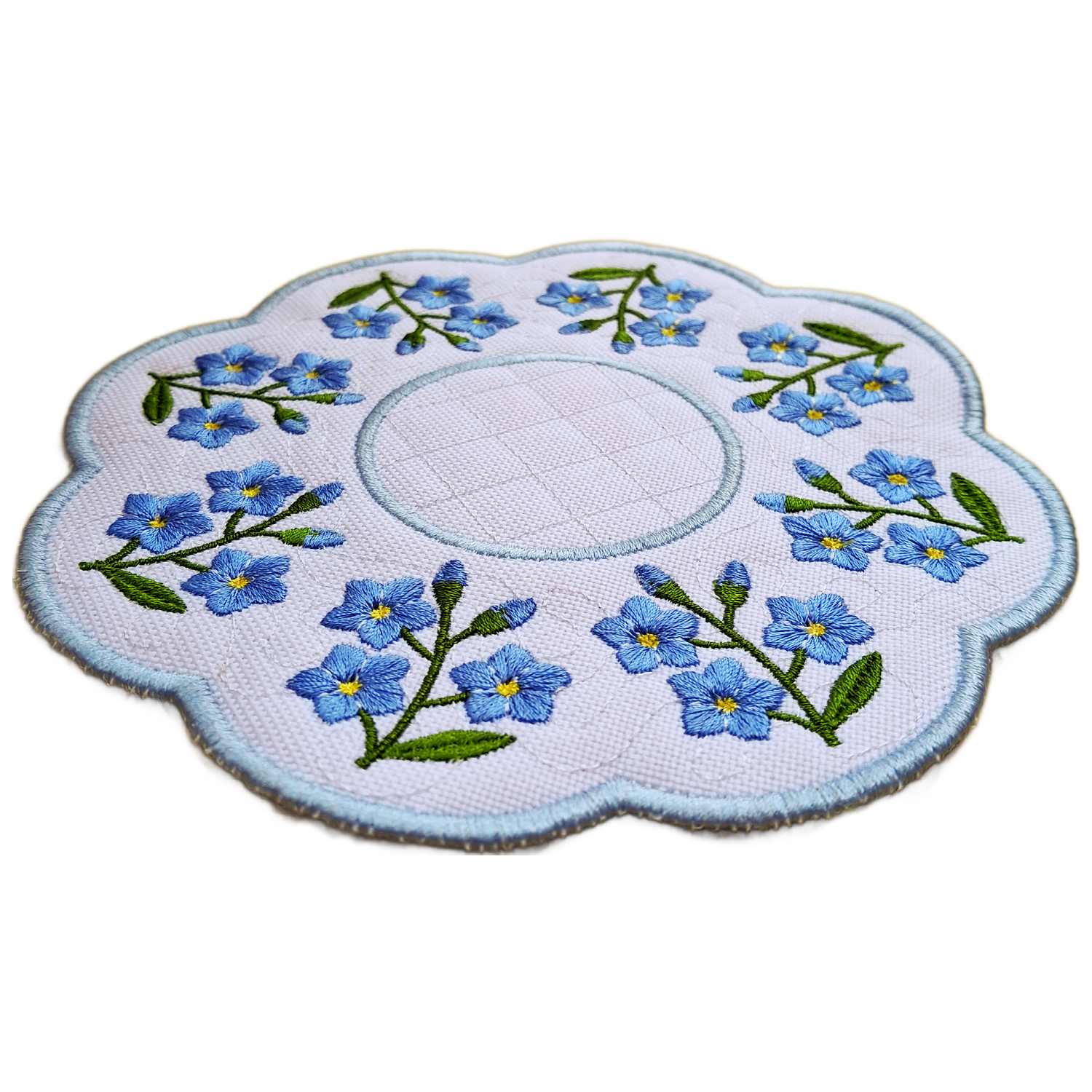 The Forget Me Not Candle Table Mat makes a lovely gift for anyone who appreciates floral design and handcrafted detail. With its soft blue blooms, stippled background, and elegant scalloped edge, it is a sweet way to celebrate love, memory, and the beauty of nature in your home.