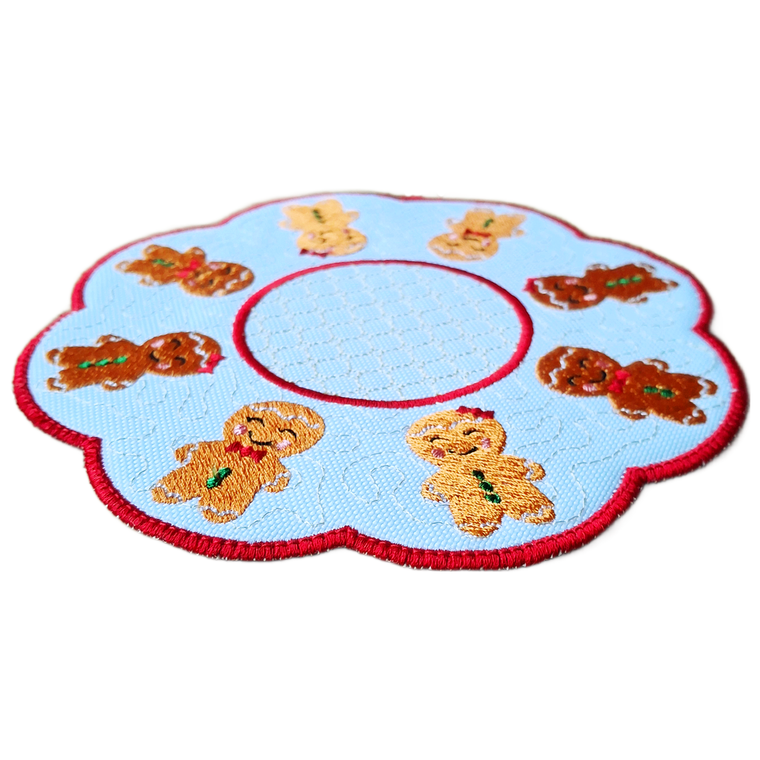 Bring a soft, cosy touch of Christmas cheer to your home with this Gingerbread Cuties Christmas Candle Mat, designed to sit beautifully beneath candles and small festive displays. Featuring sweet embroidered gingerbread characters scattered across a delicate stippled pattern, it adds warmth, charm and a hint of nostalgia to tables, shelves and cosy corners throughout the festive season.