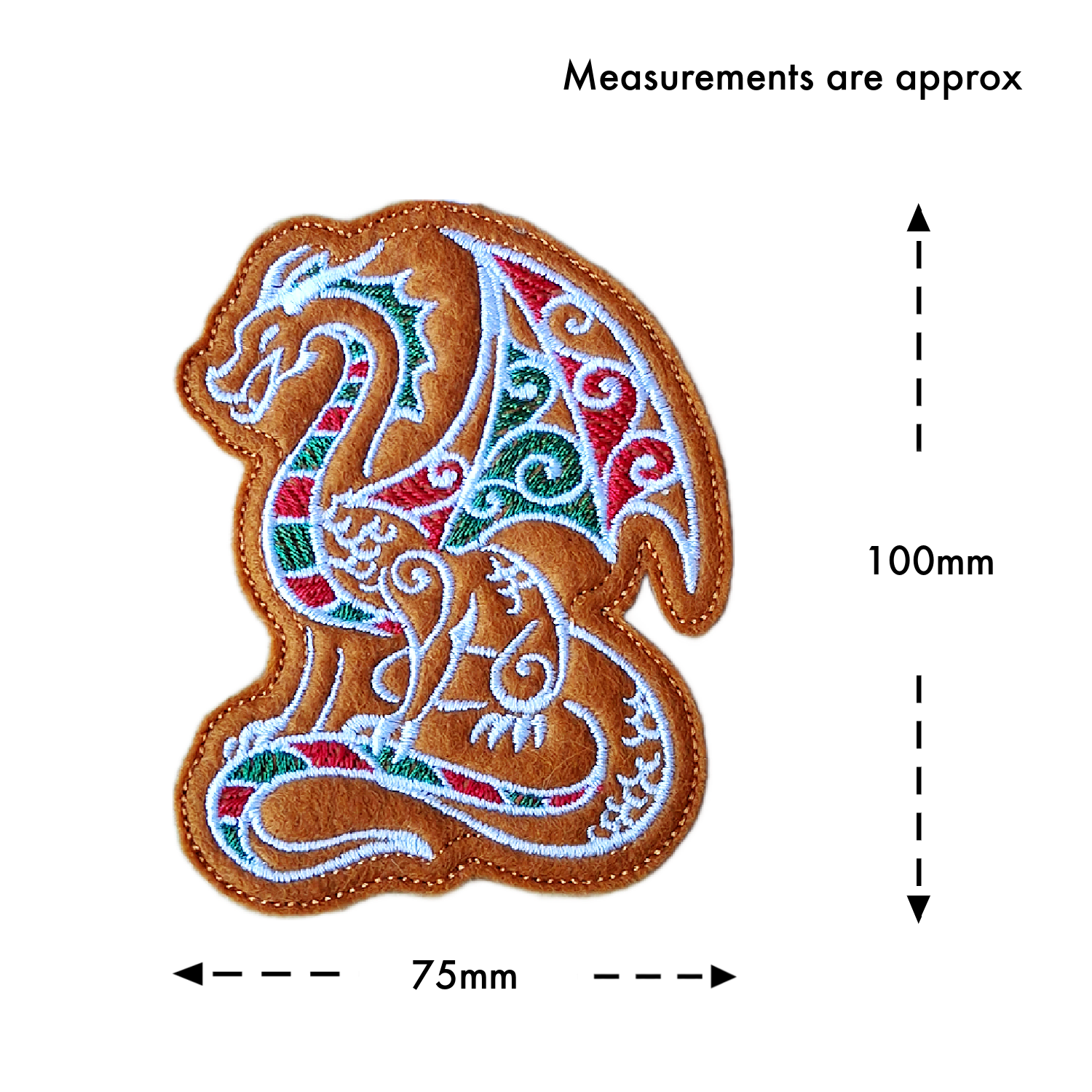 Each ornament is made from soft felt and machine embroidered with top-notch threads, creating a beautifully detailed gingerbread-style dragon that glows with festive colour.
