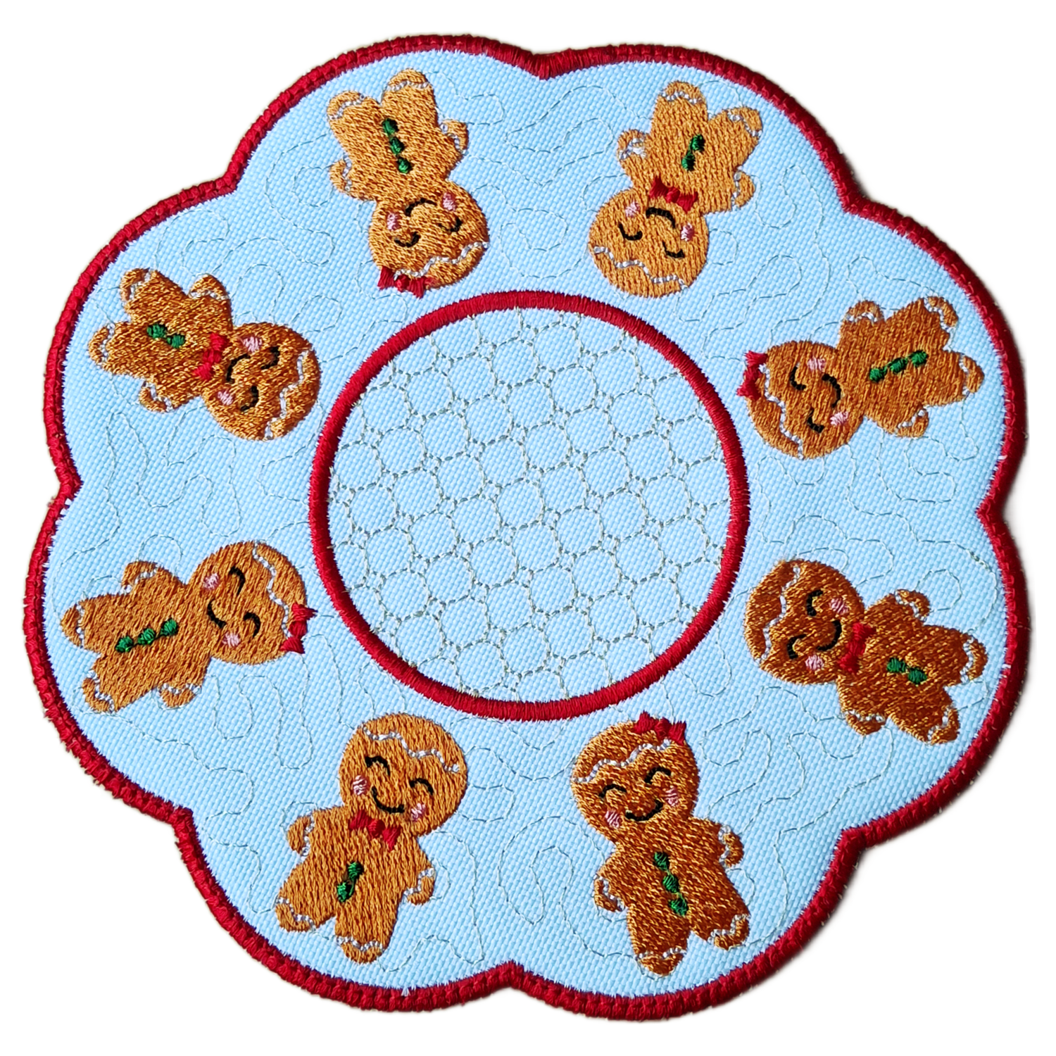 ✨🎅 Bring Sweet Festive Cheer to Your Table 🎅✨ Add a touch of Christmas magic to your home with this beautifully embroidered Gingerbread Christmas Candle Table Mat. Featuring a circle of cheerful gingerbread boys and girls with smiling faces and festive details, it captures the joyful spirit of the season – warm, welcoming, and full of charm.