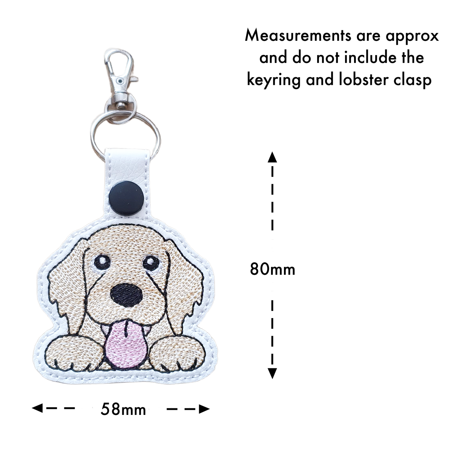 Lovingly crafted from soft faux leather and finished with beautifully detailed machine embroidery, this cheerful Golden Retriever buddy has an endearing look that feels comforting, friendly and full of gentle character. It is the perfect everyday pick-me-up – whether you are heading out the door, rummaging for your keys or simply wanting to add a playful flourish to your bag.