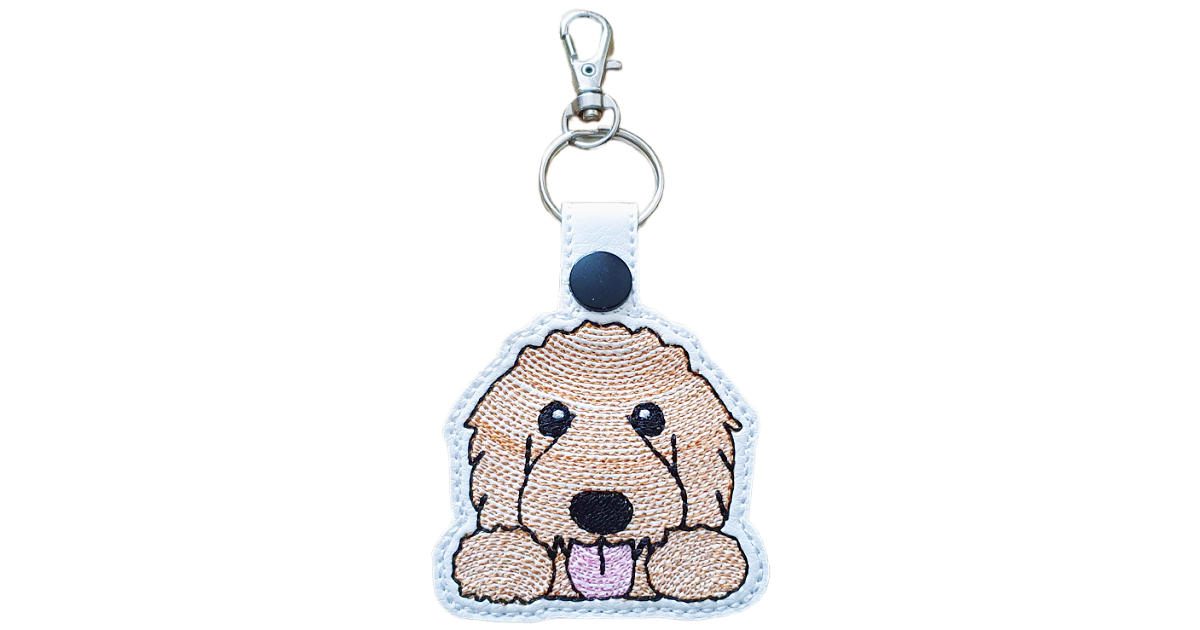 Each keyring is made from soft faux leather and decorated with detailed stitching that captures the unmistakable charm of a Goldendoodle – from its curled fur and bright embroidered eyes to that signature happy, tongue-out smile. The textured stitching gives it a cosy handmade feel, full of gentle character and perfect for adding a touch of cuteness to your everyday essentials.