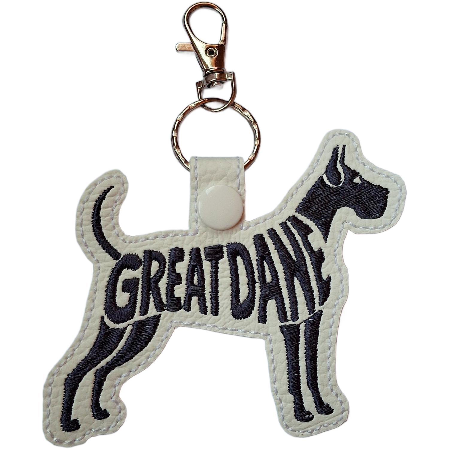 Each keyring is made from soft faux leather and finished with detailed machine embroidery using premium threads. The stitched word-art follows the Great Dane’s tall, iconic outline, adding texture and charm without overwhelming the design. Every piece is thoughtfully created to reflect the strength, beauty and gentle spirit of this much-loved breed.