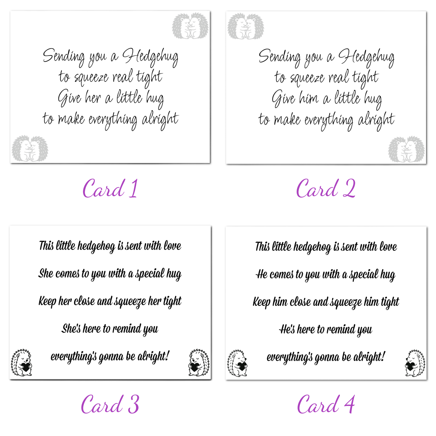 Each hedgehog comes with a printed keepsake card featuring a comforting little verse. You can choose from four card designs (see images for designs), each with its own wording and option for a girl or boy hedgehog poem. If you would like a personal message printed on the back, simply add your wording at checkout.