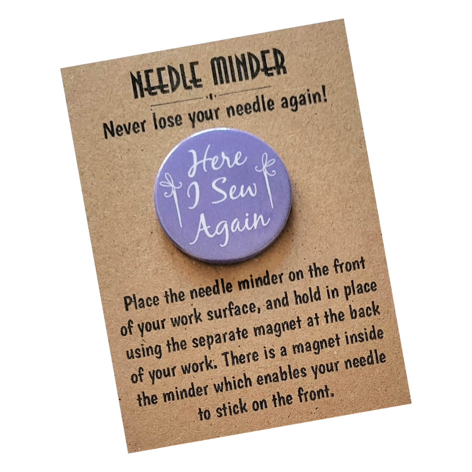Featuring the playful phrase ‘Here I Sew Again’ in a flowing script style, this needle minder brings a smile to your hoop, frame, or fabric. Its clean, cheerful design makes it a lovely addition to any stitching setup and a gentle nod to the joy of returning to your craft time and time again.