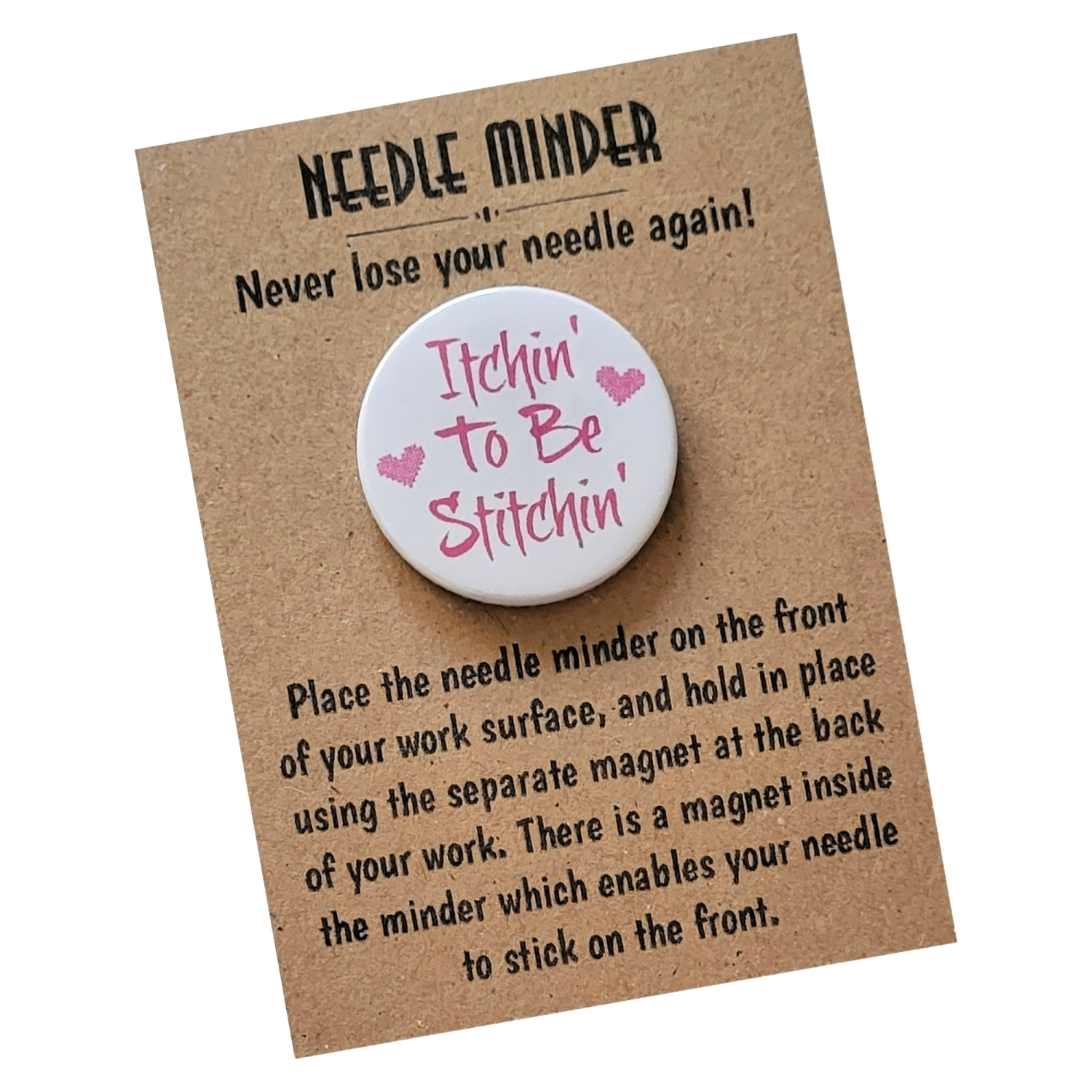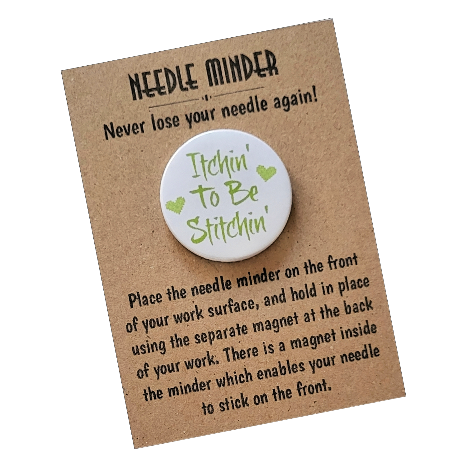 Presented on a kraft backing card and packaged in a protective sleeve, the Itchin’ to Be Stitchin’ Needle Minder makes a thoughtful gift for stitchers of all levels. Ideal for birthdays, sewing groups, craft friends, or as a small treat for yourself, it is a practical keepsake designed to be enjoyed again and again.