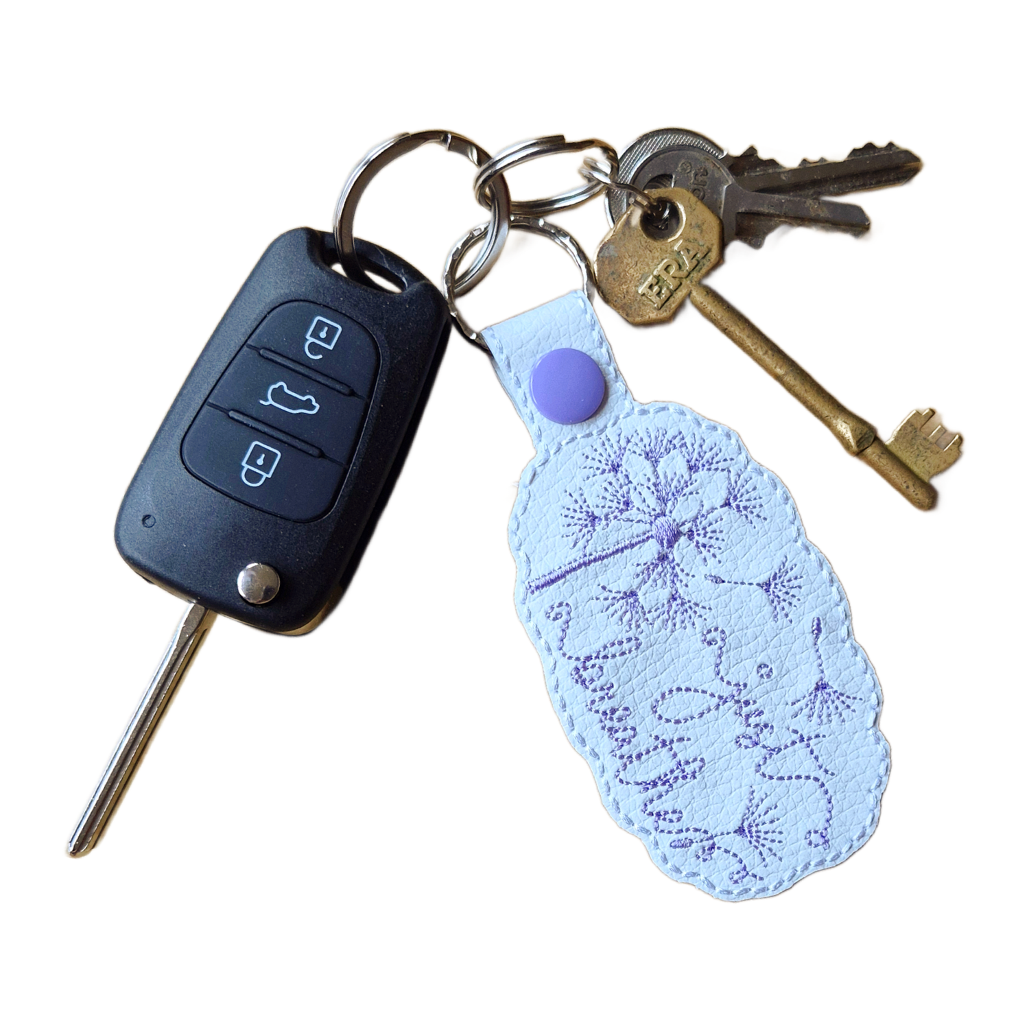 This keyring is available in either black or white faux leather.