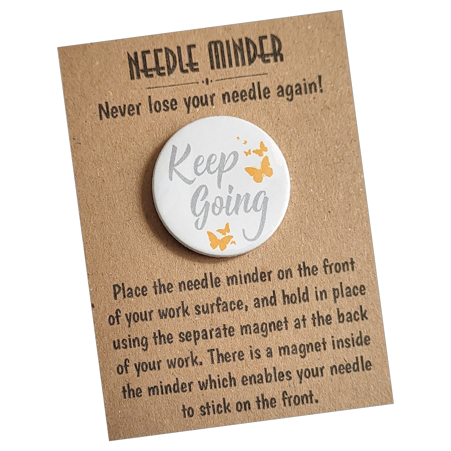 Presented on a kraft backing card and packaged in a protective sleeve, the Keep Going Needle Minder makes a thoughtful gift for stitchers of all levels. Ideal for birthdays, craft friends, sewing groups, or as a gentle reminder for yourself, it is a practical keepsake designed to be enjoyed again and again.