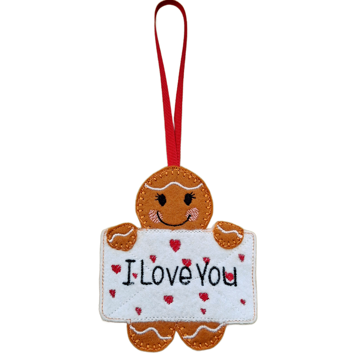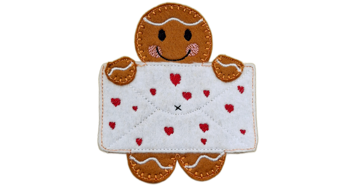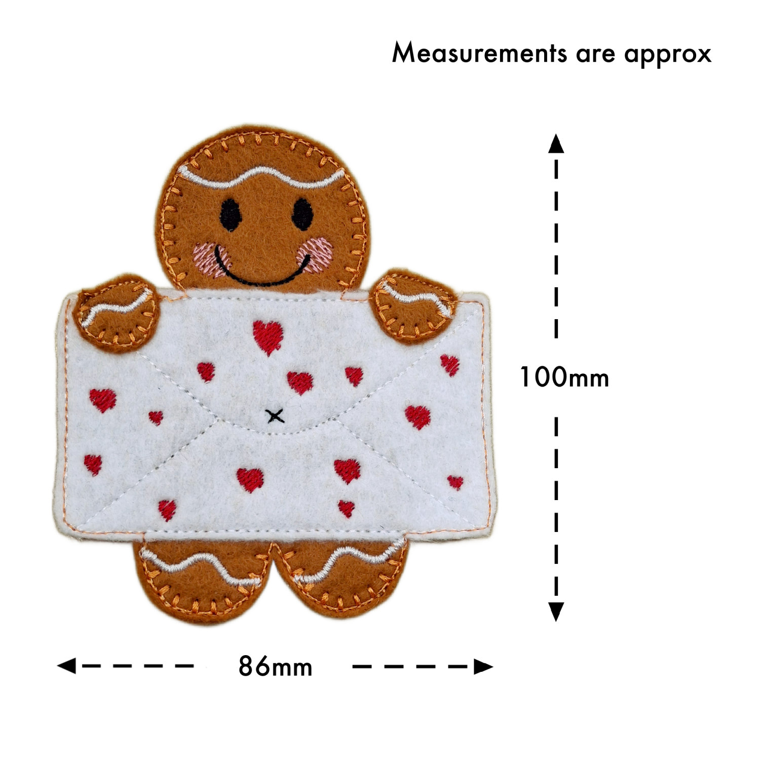 Each gingerbread character is lovingly handmade from soft felt and detailed with high-quality embroidery threads. From the rosy cheeks and icing-style trims to the stitched envelope filled with embroidered hearts, every piece is carefully made with attention to detail and a touch of handmade charm.