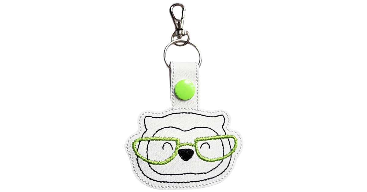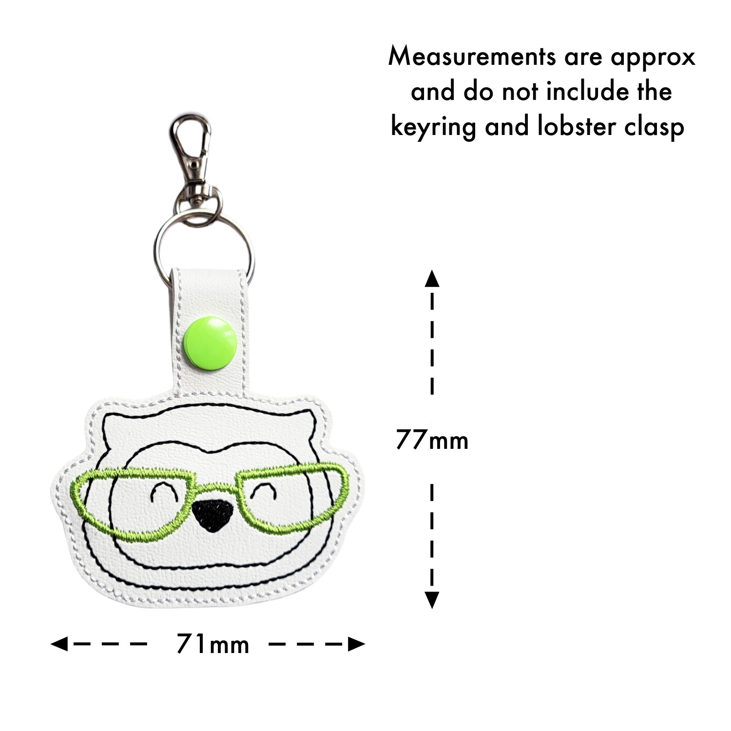 White faux-leather keyring shaped like a cute owl’s face, with embroidered black outlines and bright green stitched glasses. Attached to a metal split ring and swivel clasp. White faux-leather owl keyring with green embroidered glasses shown with measurements. The owl section measures approximately 77 mm tall and 71 mm wide.