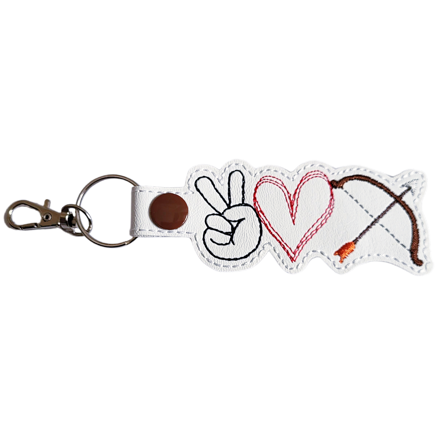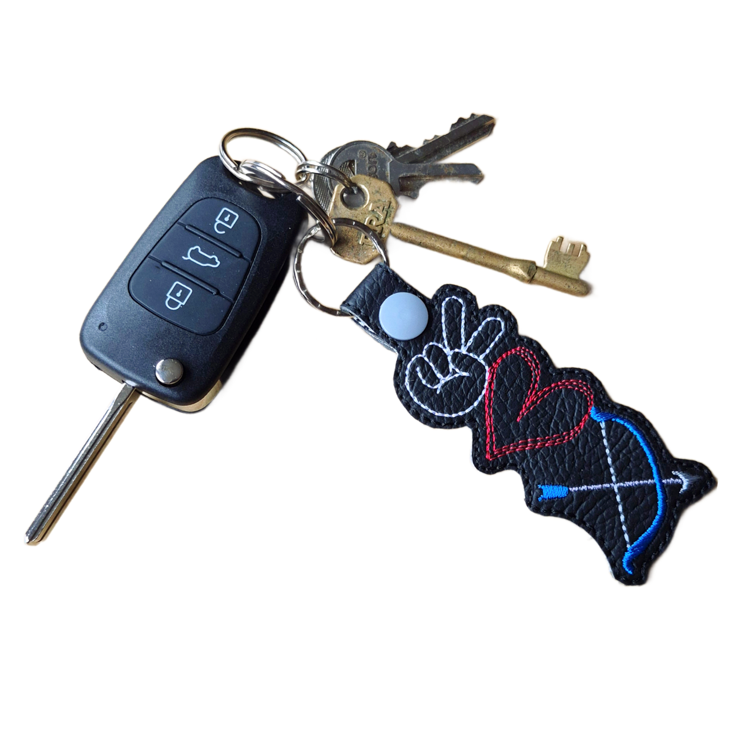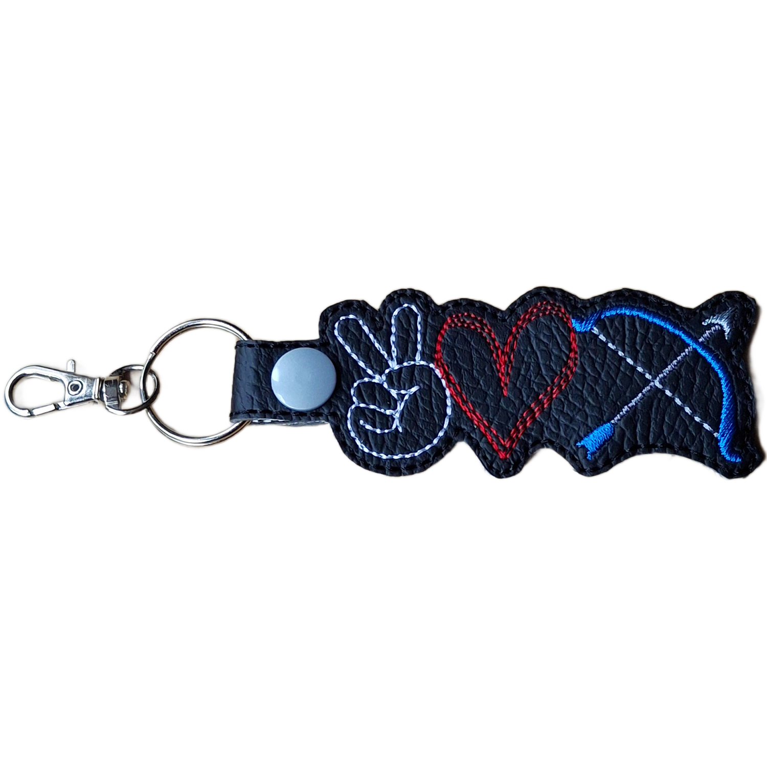 🏹 Design & Materials Made from faux leather and machine embroidered with high quality threads, this lightweight yet durable keyring is designed for everyday use. Ideal for keys, bags or kit zips, it is finished with a sturdy metal ring and clasp to keep it secure without adding bulk.