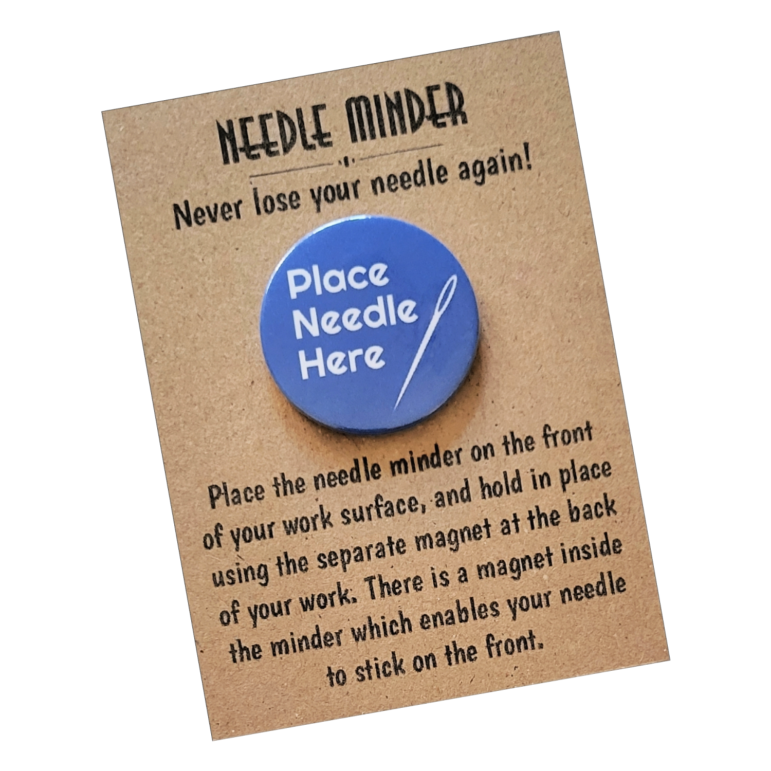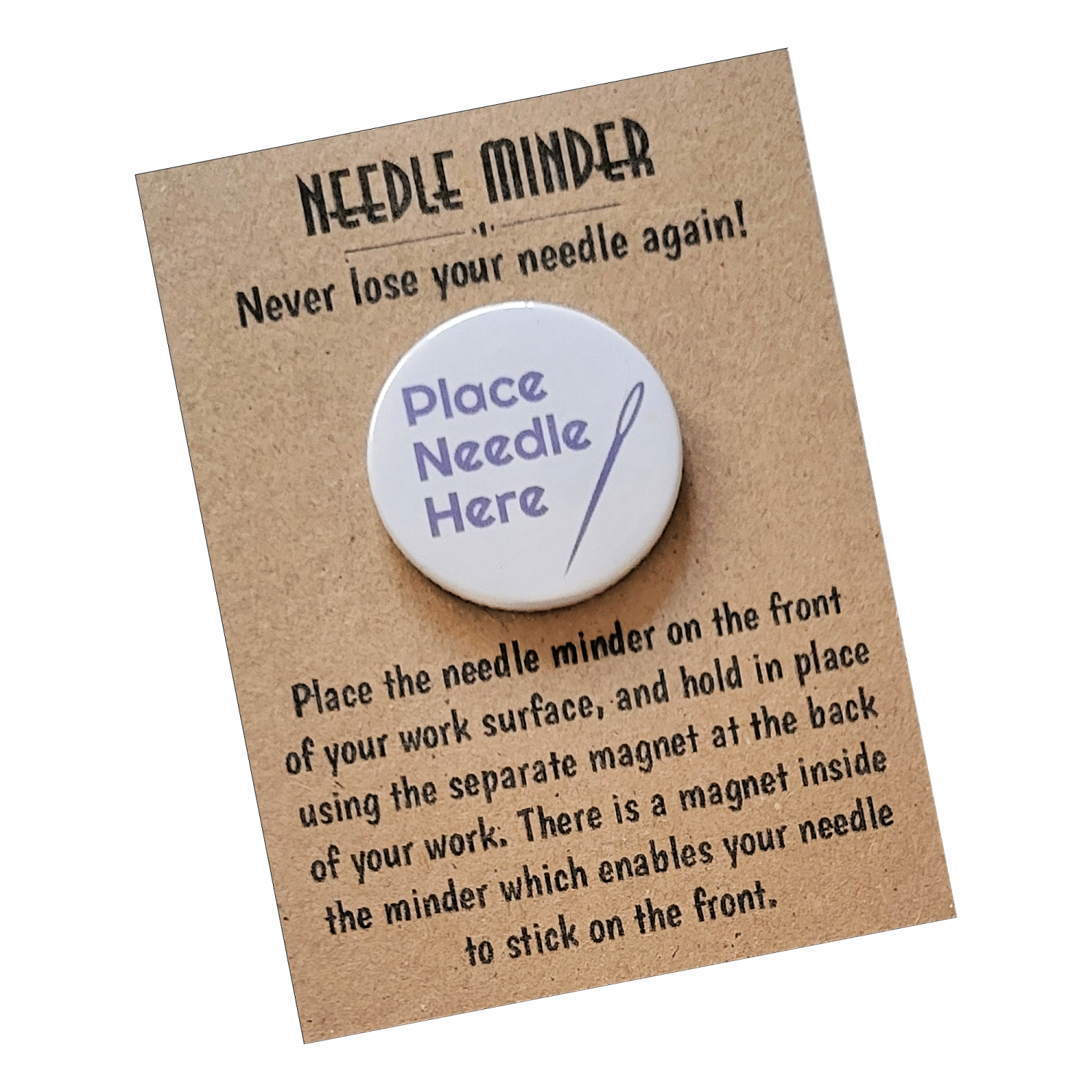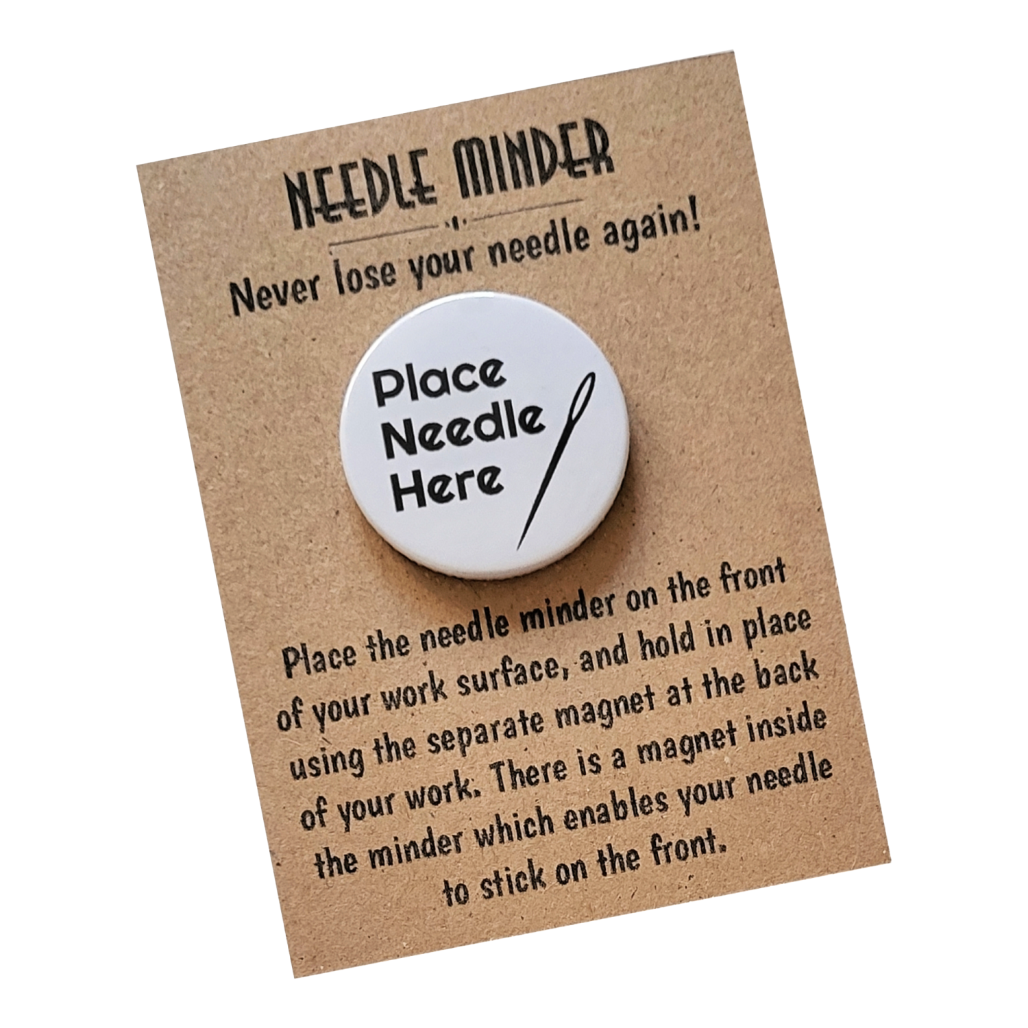 Presented on a kraft backing card and packaged in a protective sleeve, the Place Needle Here Needle Minder makes a thoughtful gift for stitchers of all levels. Ideal for sewing groups, craft friends, or anyone who loves a tidy stitching space, it is a practical keepsake designed to be used and enjoyed.