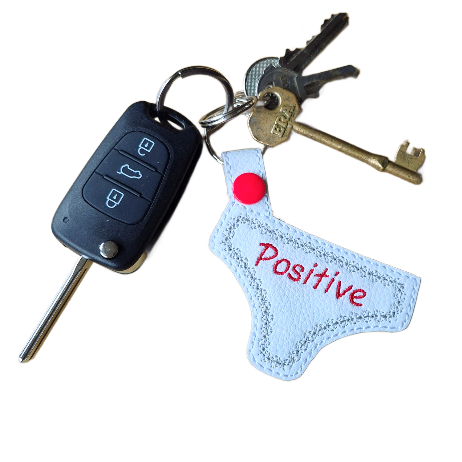 🧵 Made with Care Lovingly made from faux leather and machine embroidered using high quality threads, this Positive Pants keyring is carefully stitched for a neat, detailed finish. Soft yet durable, it is lightweight enough for everyday use while still feeling sturdy and well made.