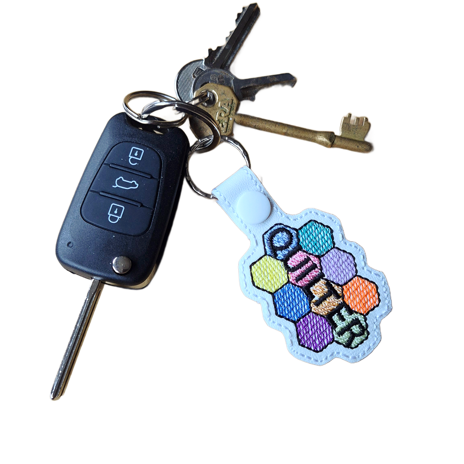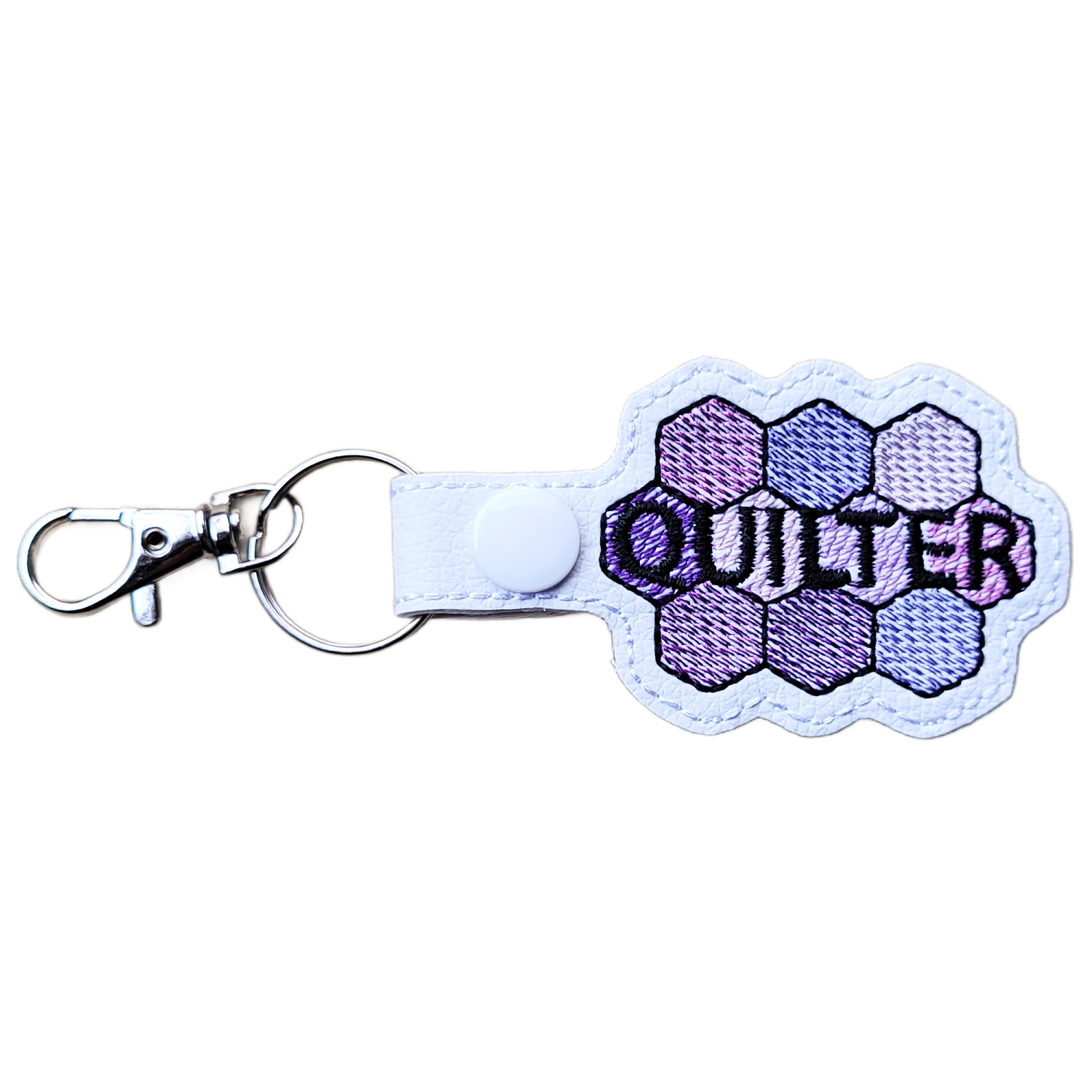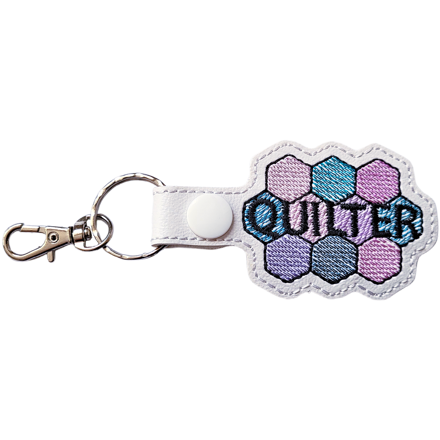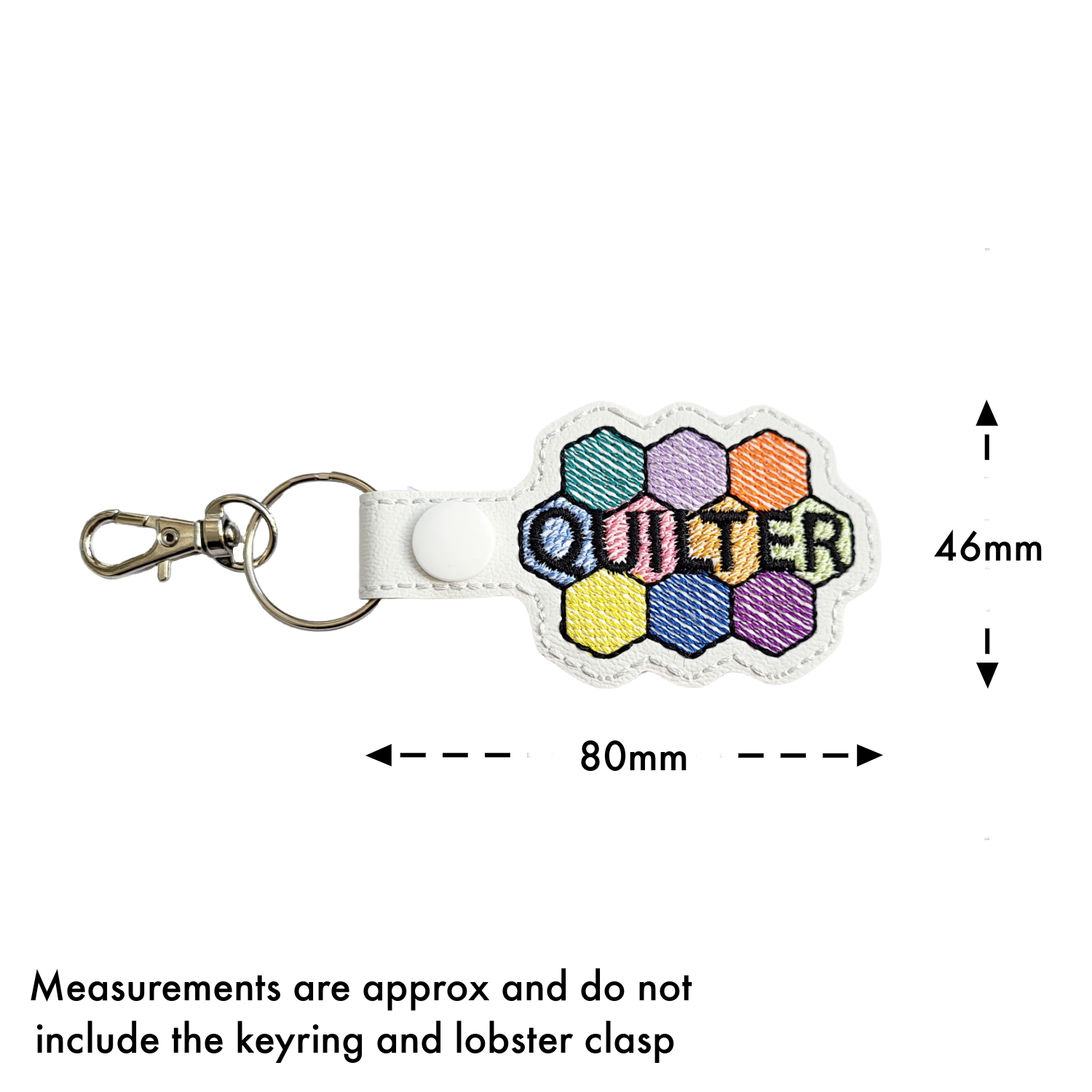 Each keyring is carefully crafted from faux leather and machine embroidered using high-quality threads, giving it a slightly padded feel that is lightweight, durable, and comfortable to use. Finished with a sturdy metal clasp and keyring, it is perfect for keys, bags, or project totes – a practical accessory with plenty of personality.