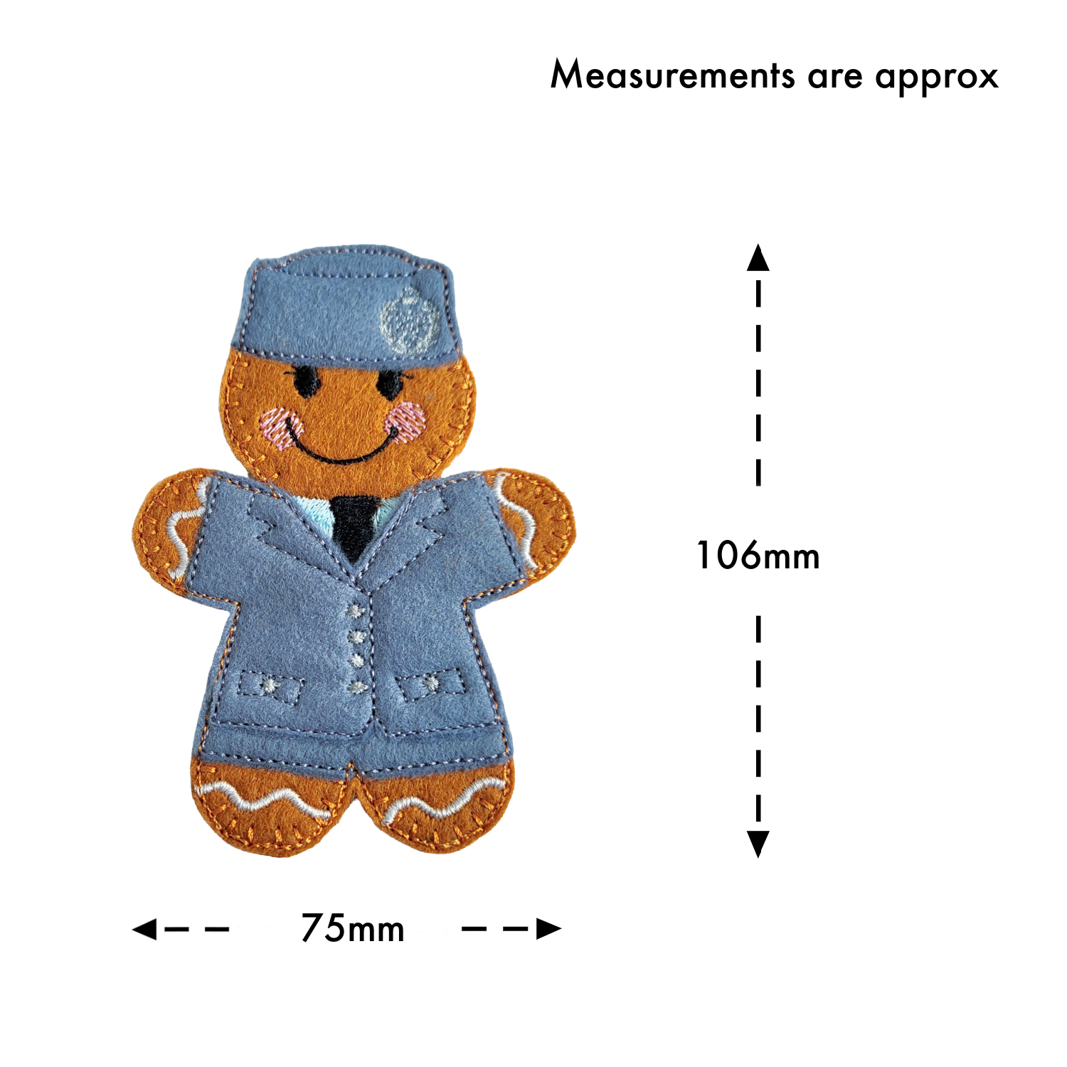 Each gingerbread character is carefully made from soft felt and machine embroidered using high-quality threads. From the neatly stitched uniform details and cap badge to the friendly gingerbread smile and rosy cheeks, every element is created with patience, care, and attention to detail.