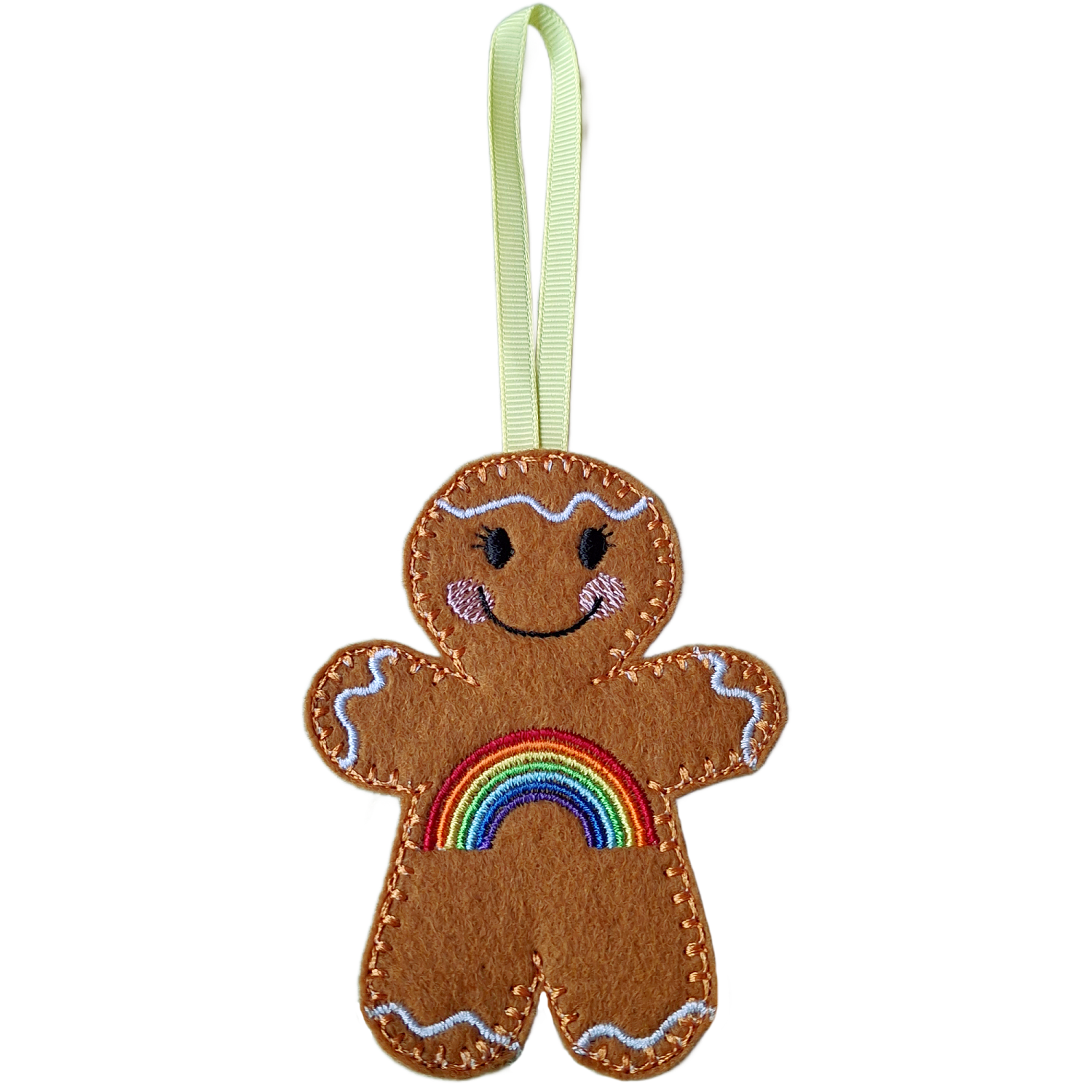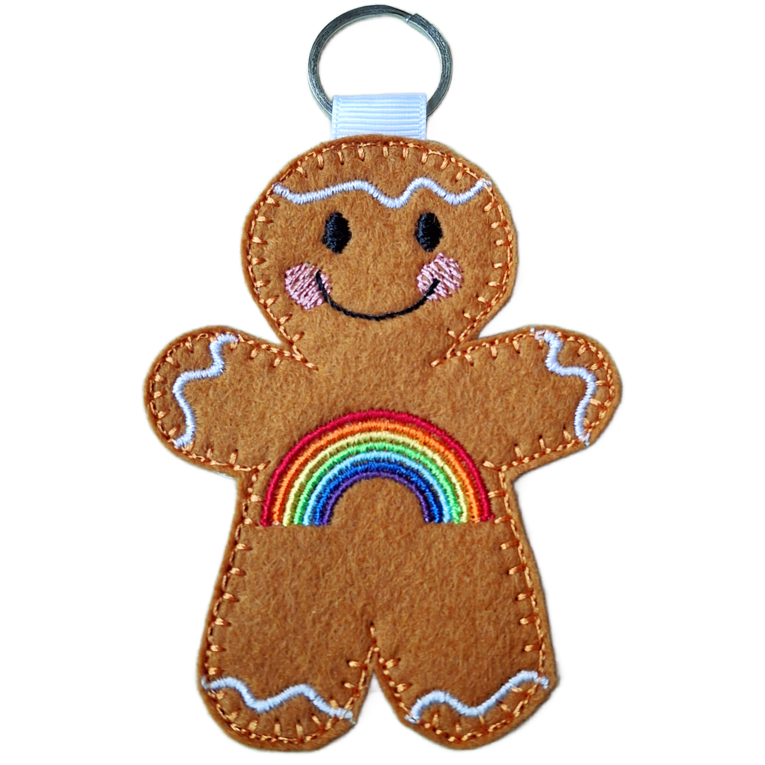 Gingerbread Rainbow Character – a handmade felt gingerbread figure with a stitched smile, pink cheeks, white icing detail, and a bright embroidered rainbow across its tummy. Gingerbread Rainbow Character with approximate measurements shown – 95mm in height and 73mm in width. The handmade felt gingerbread features white icing details, pink cheeks, and an embroidered rainbow across its tummy. Handmade felt gingerbread figure with an embroidered rainbow across its tummy, pink cheeks, and white icing detail, shown with a yellow ribbon loop for hanging. Handmade felt gingerbread with a bright embroidered rainbow, pink cheeks, and white icing trim, finished with a metal keyring attachment on a white ribbon tab.