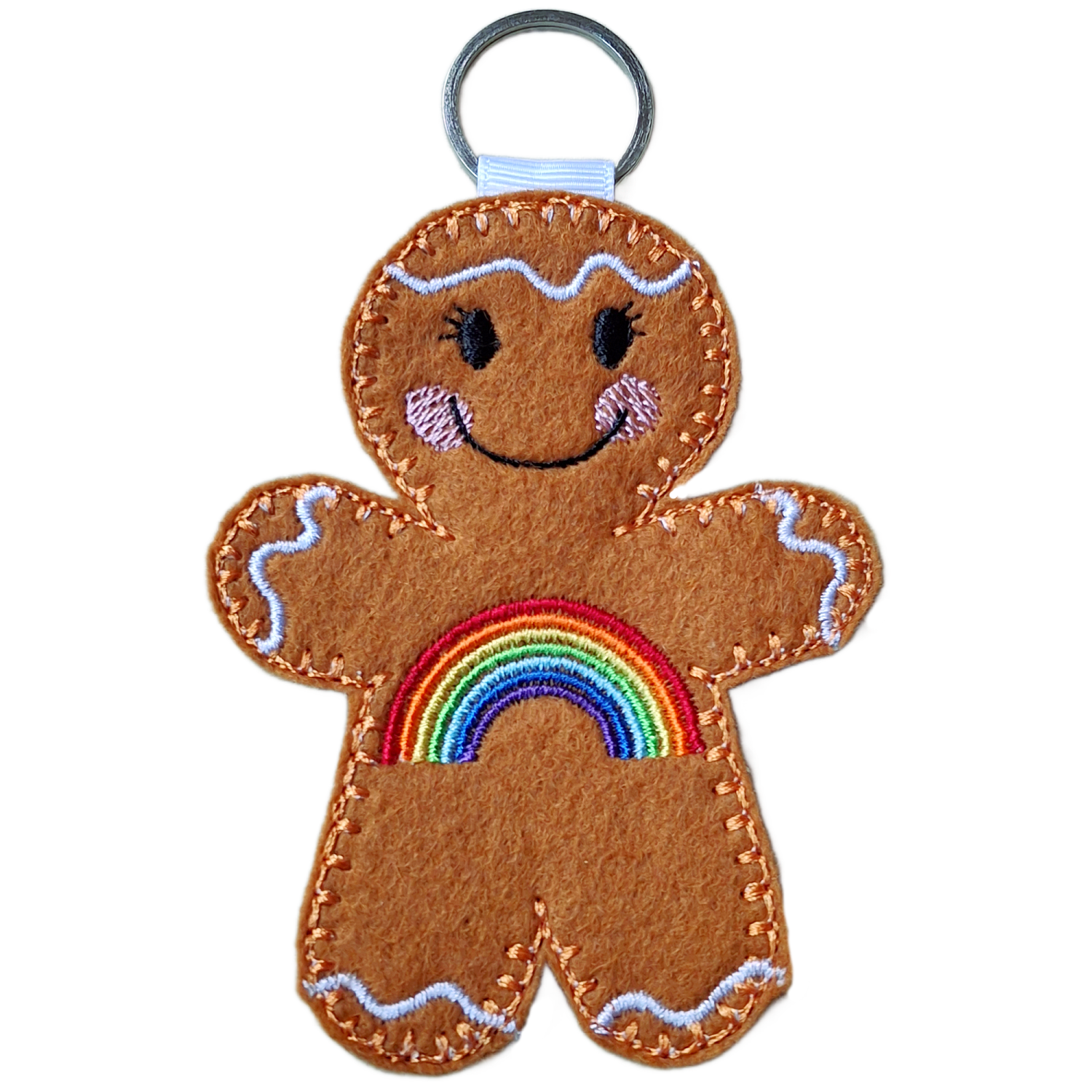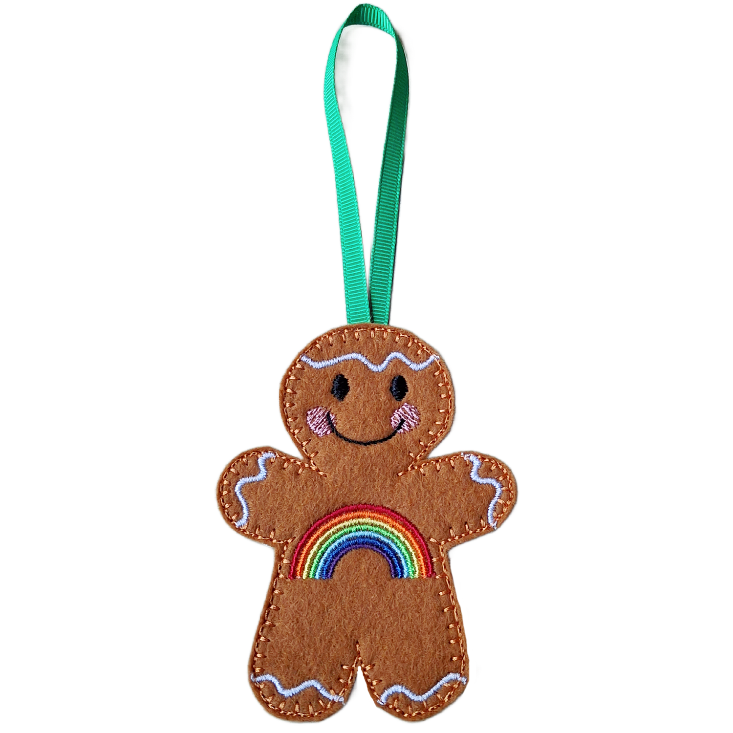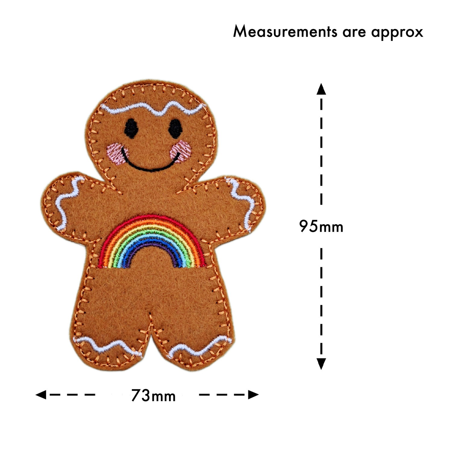 Lovingly made from soft felt and machine embroidered using high quality threads, each gingerbread character is carefully crafted with attention to every detail. From the sweet stitched smile and rosy cheeks to the vibrant rainbow stitching, every element is designed to feel warm, reassuring, and full of heart.