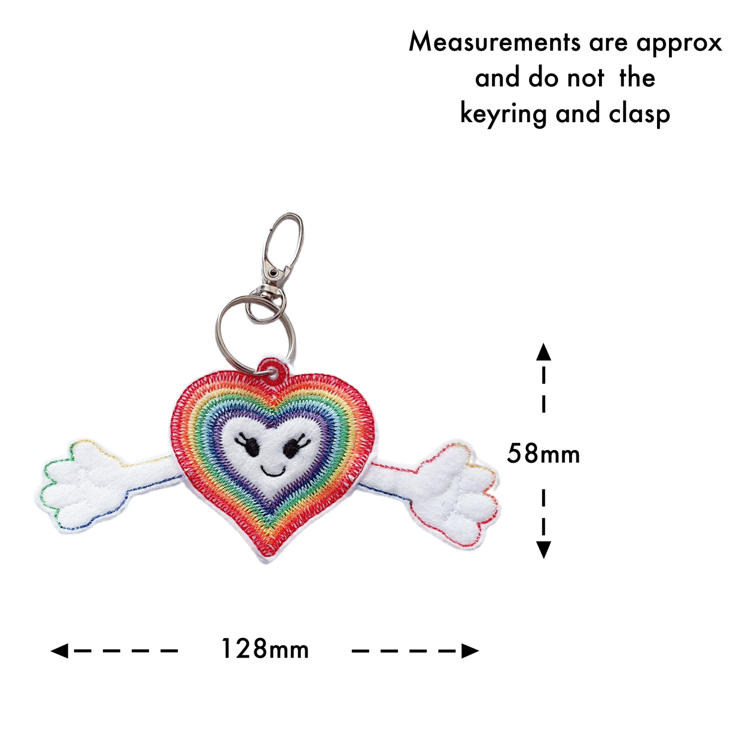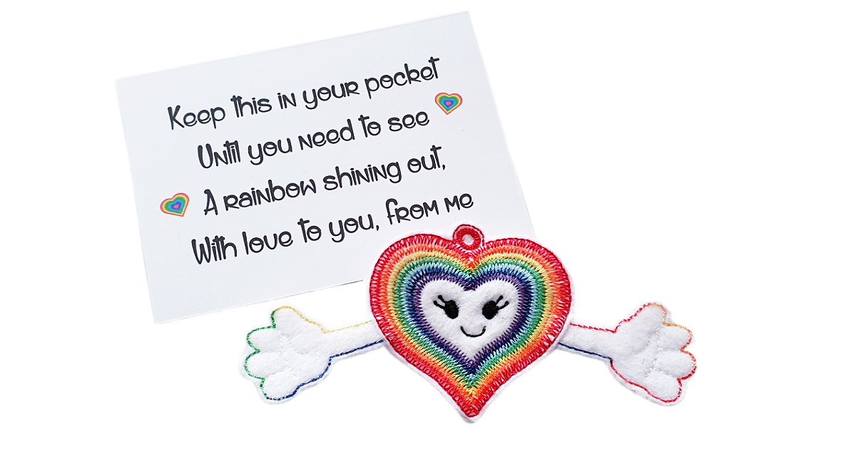 Each rainbow heart is carefully crafted from soft felt and beautifully machine embroidered using high-quality threads, creating a vibrant, neatly finished piece with a touch of handmade charm. With its outstretched arms and friendly stitched expression, this little hug carries a message of comfort and hope, ready to brighten even the cloudiest of days.
