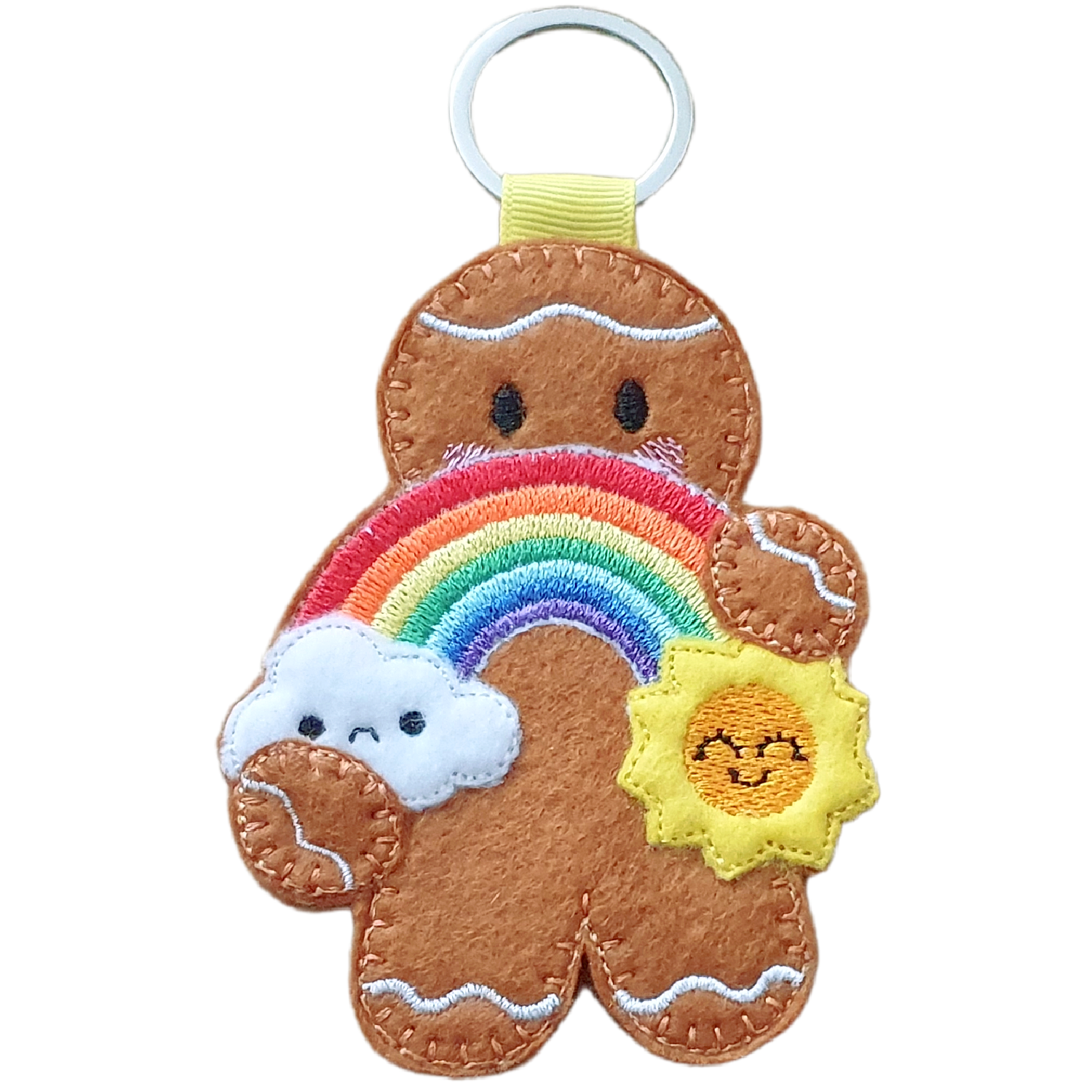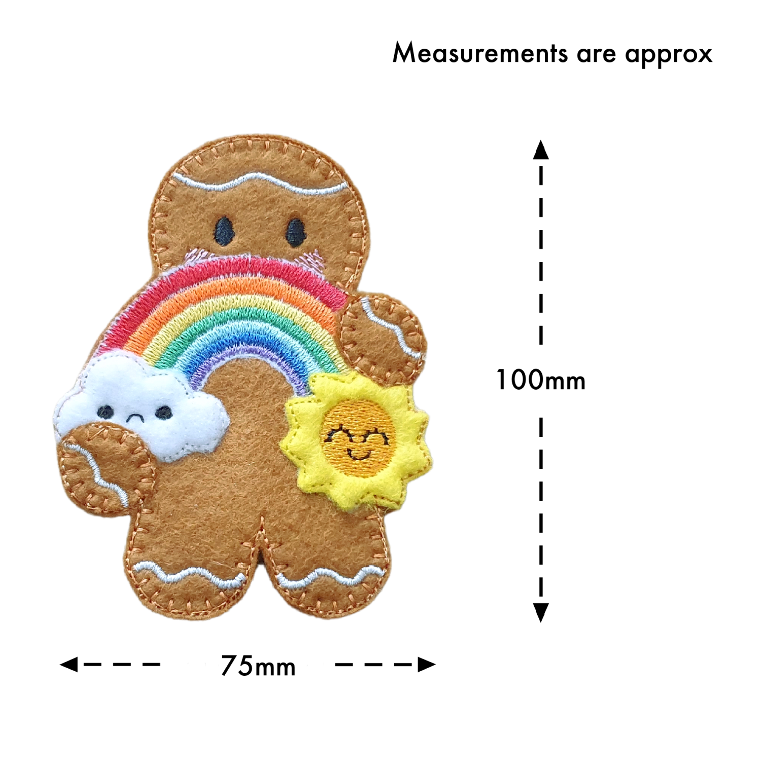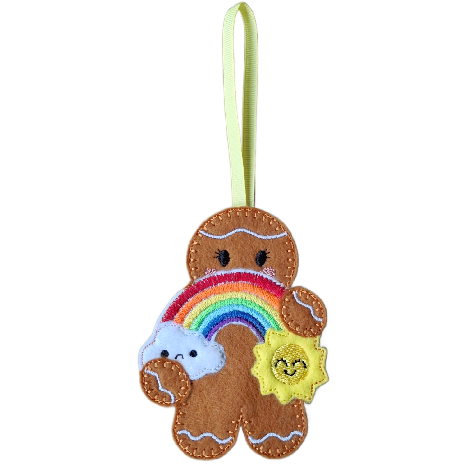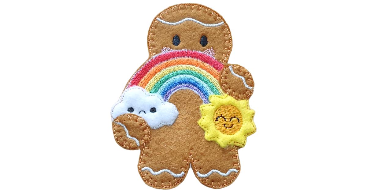 Lovingly made from soft felt and machine embroidered using high quality threads, each gingerbread is carefully crafted with attention to every detail. From the sweet stitched smile and rosy cheeks to the radiant sunshine and rainbow arch, each element is designed to celebrate positivity, encouragement, and happiness.