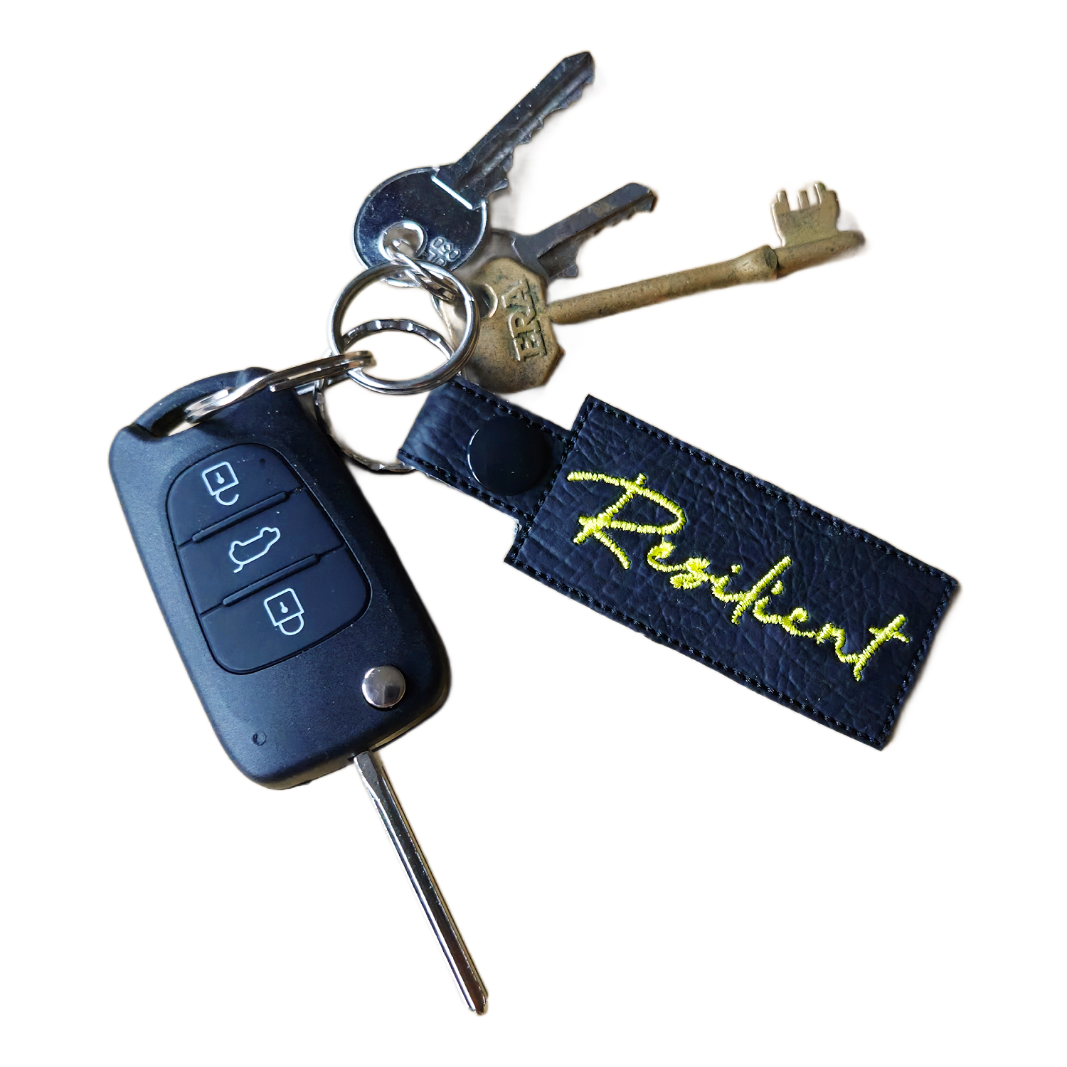 Made from faux leather and machine embroidered with high quality threads, this keyring combines a soft, tactile feel with clear, beautifully stitched lettering. Finished with sturdy hardware, it is designed for daily use on keys, bags, or backpacks while remaining lightweight and comfortable to carry.