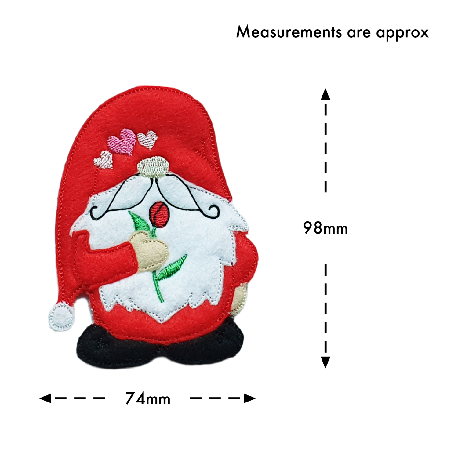Please use the boxes at checkout to select your preferred colours for the gnome’s outfit, hearts, and rose.