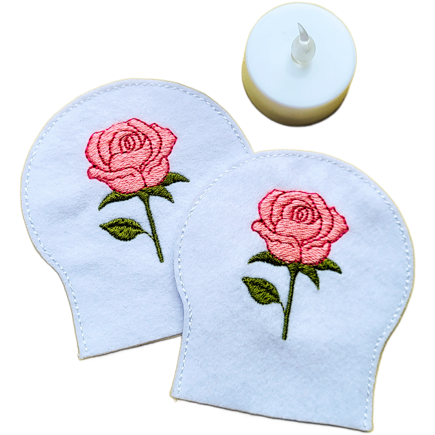 Add a soft, romantic glow to your home with these beautifully embroidered Rose Tealight Covers. Each handmade cover features a single rose bloom, delicately stitched in rich pink tones with soft green leaves on pure white felt. The detailed embroidery captures the timeless symbolism of the rose – love, gratitude, and beauty – while allowing gentle candlelight to glow through, creating a warm and welcoming atmosphere.