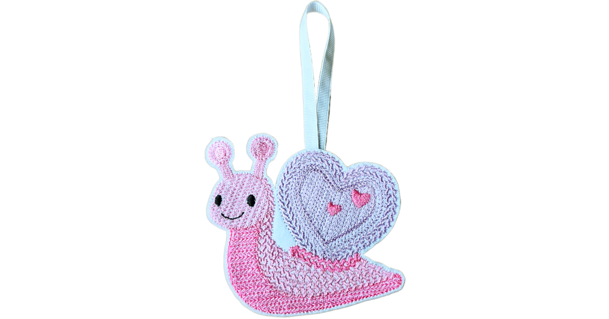 The snail is stitched using two colours – these can be the same colour in different shades, or two contrasting colours. The small hearts on the ‘shell’ will be stitched in the same colour as the bottom of the snail, creating a balanced and thoughtful finish.