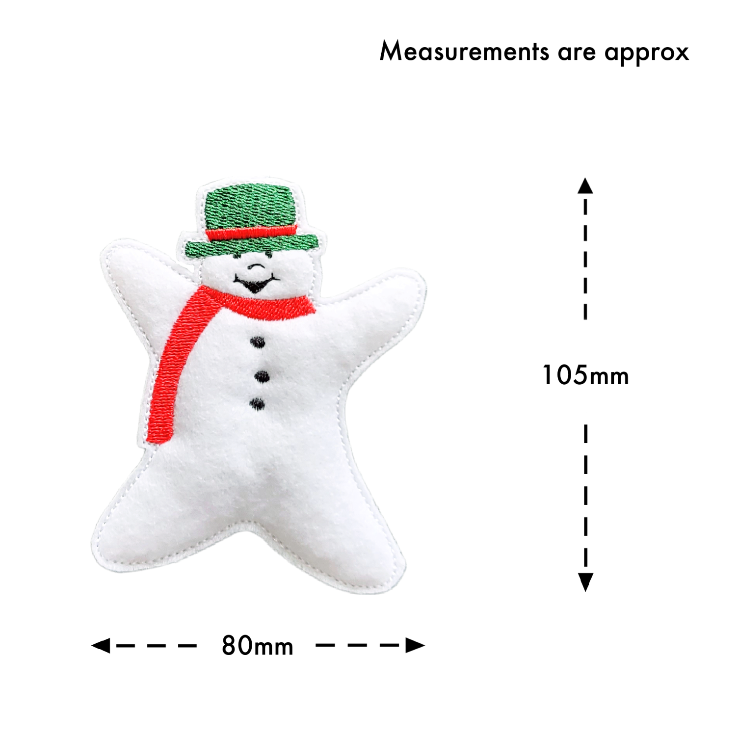 Details: • 🧵 Handmade from soft felt and machine embroidered with high-quality threads • 🎀 Finished with white hanging ribbons • 📏 Approximate sizes: • Snowlady – 78mm wide x 105mm high • Snowman – 80mm wide x 105mm high • 🎨 Choose your hat and scarf colours – add details at checkout • 🎁 Available individually or as a set of both