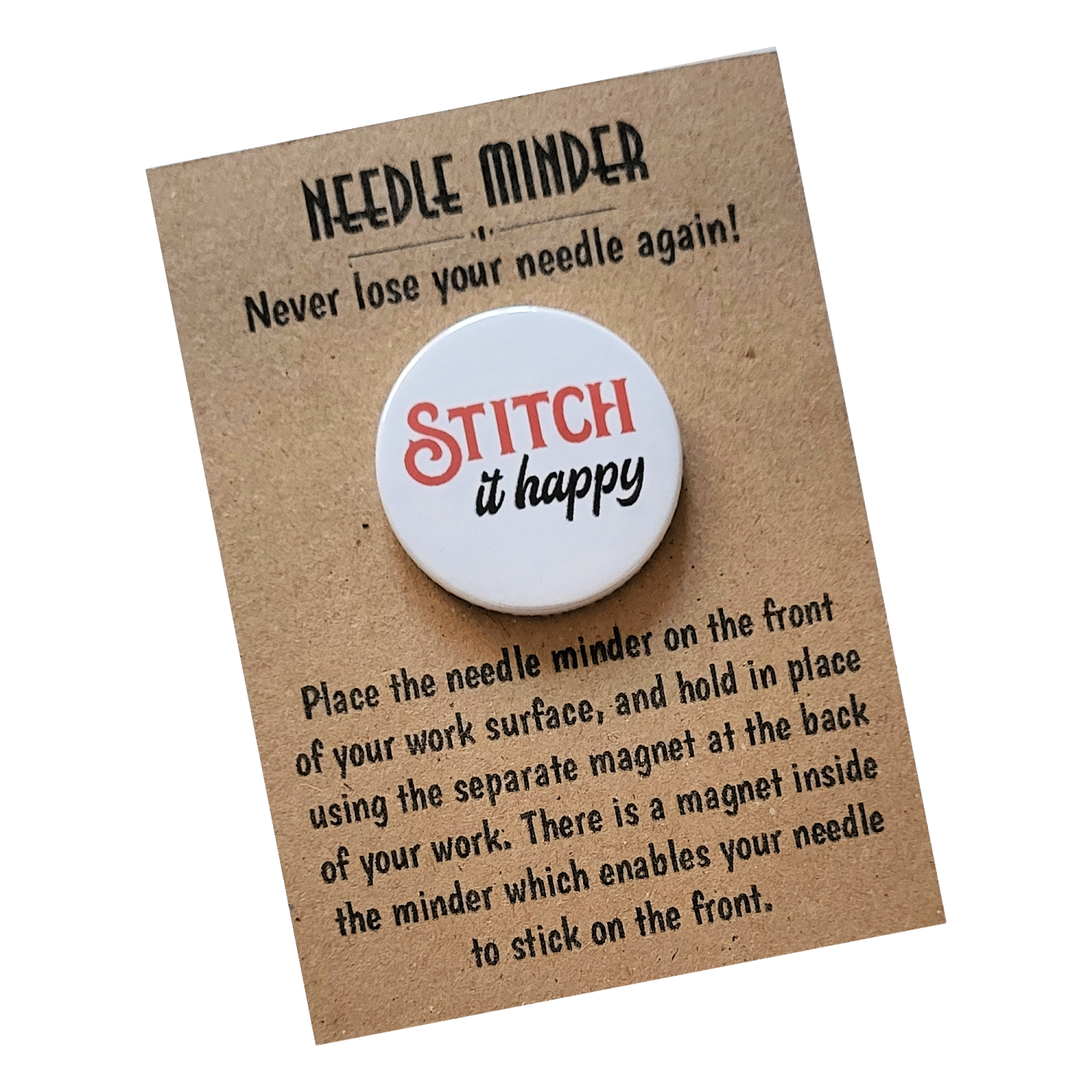Presented on a kraft backing card and packaged in a protective sleeve, the Stitch It Happy Needle Minder makes a thoughtful gift for stitchers of all levels. Ideal for birthdays, craft friends, sewing groups, or as a small treat for yourself, it is a practical keepsake that brings a little happiness to every project.