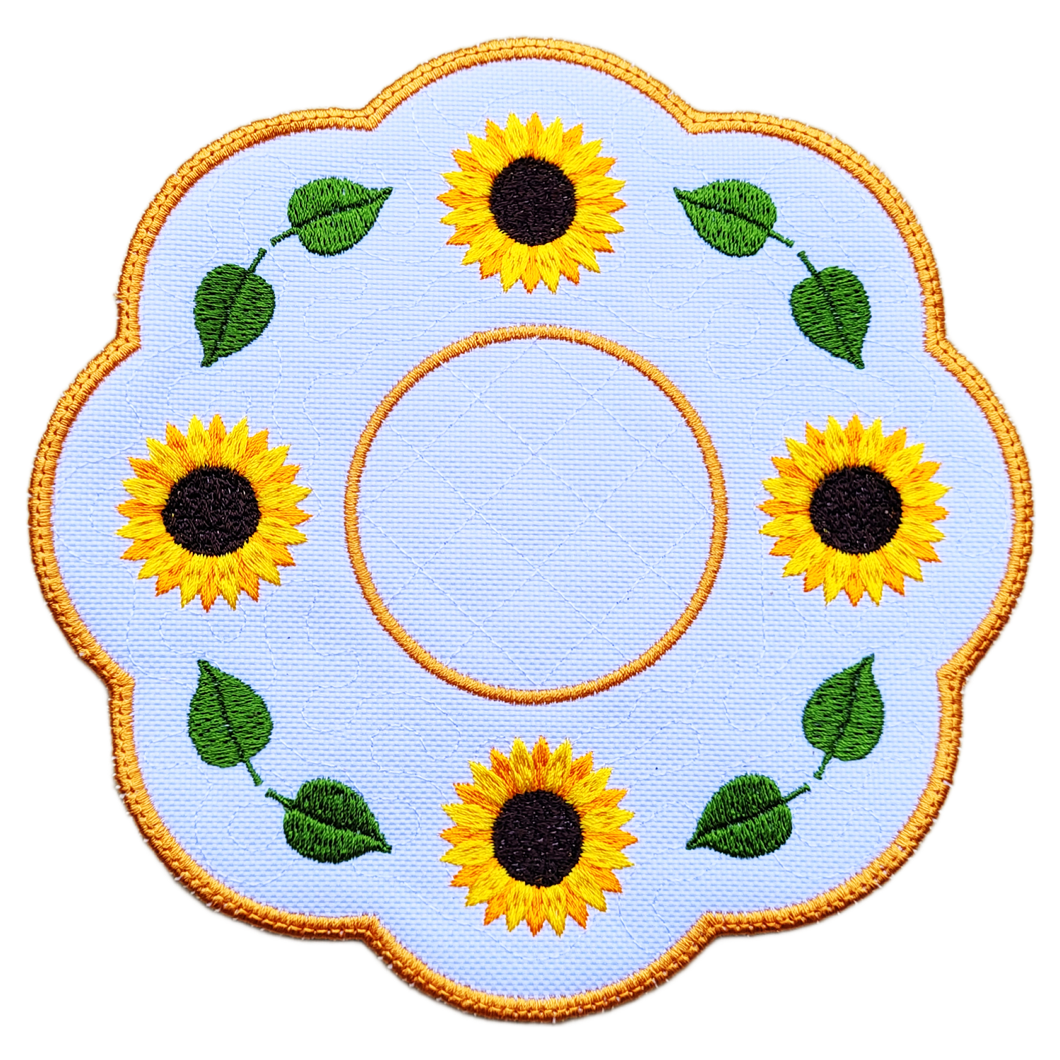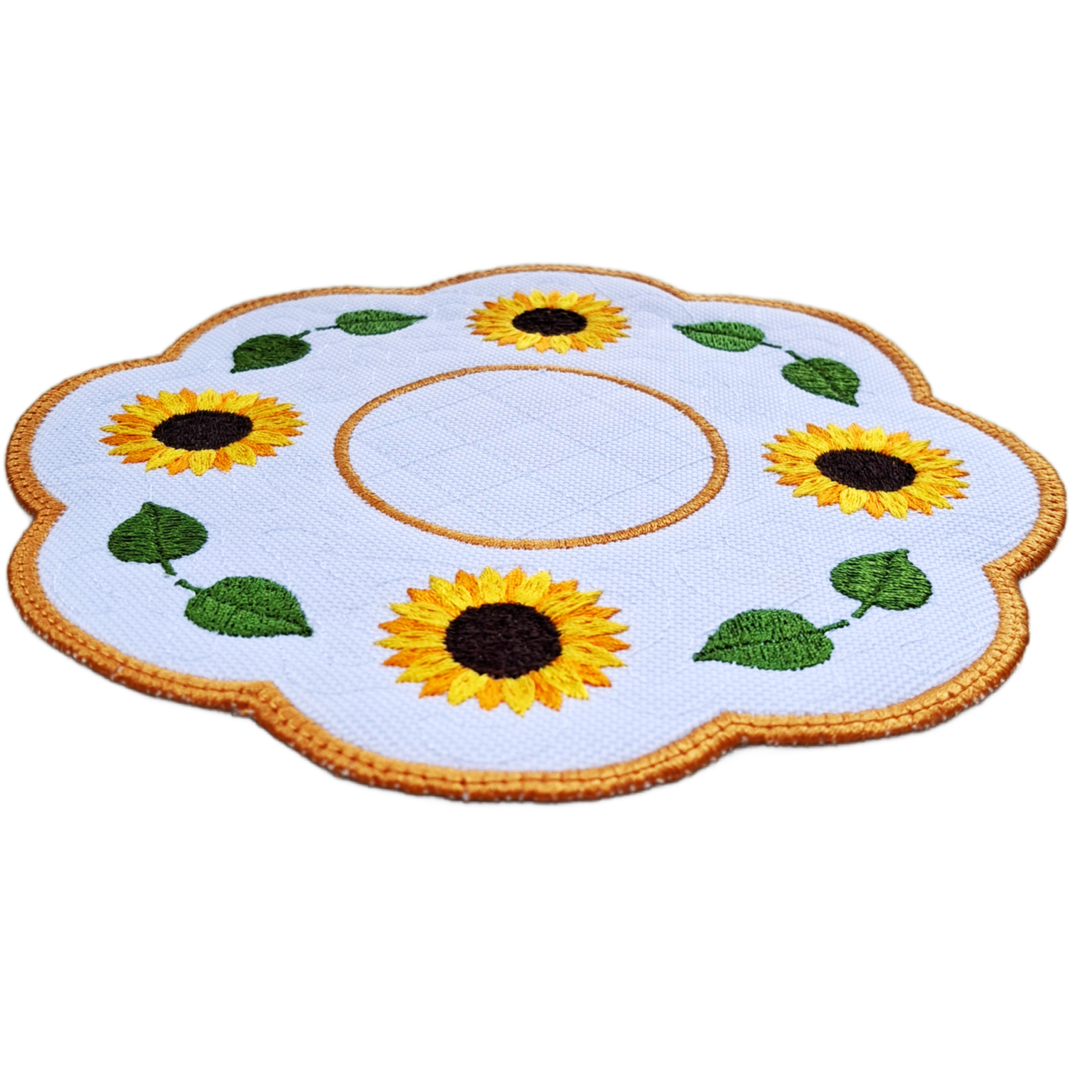 A round embroidered candle mat featuring bright yellow sunflowers and green leaves arranged around the edge, shown with a glass candle placed at the centre. A close-up view of a round embroidered candle mat decorated with bright yellow sunflowers and green leaves arranged around the edge, with a stitched circular centre and scalloped border. An angled view of a round embroidered candle mat featuring bright yellow sunflowers and green leaves around the edge, with a stitched circular centre and scalloped border. White, flower-shaped embroidered table mat with green lily of the valley designs and a yellow scalloped edge, featuring the text “Happy Mother’s Day” stitched in the centre. White, flower-shaped embroidered table mat with a purple heart pattern and scalloped edge, featuring gold initials “BG” in the centre.
