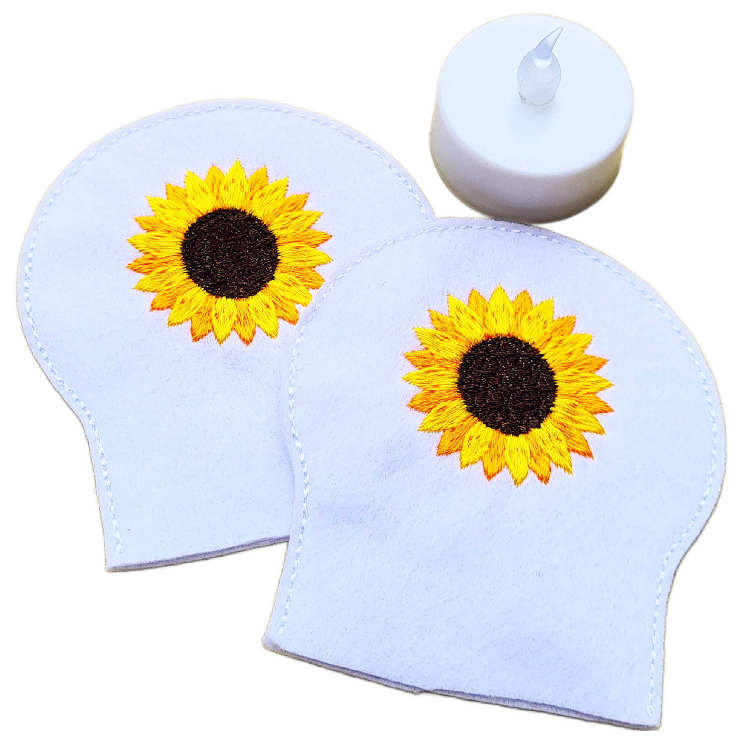 Each cover is carefully machine embroidered with premium-quality threads on sturdy white felt, allowing light to gently shine through the stitched sunflower design. Designed to slip easily over standard LED tealights, they create a beautiful glowing effect without the need for an open flame.