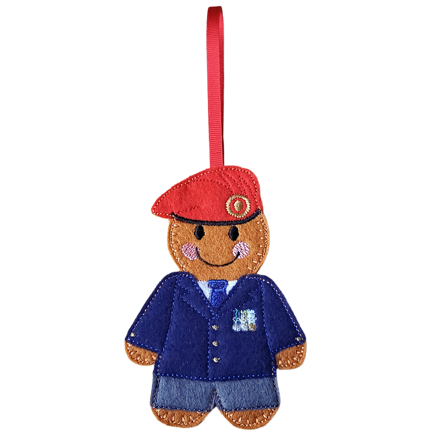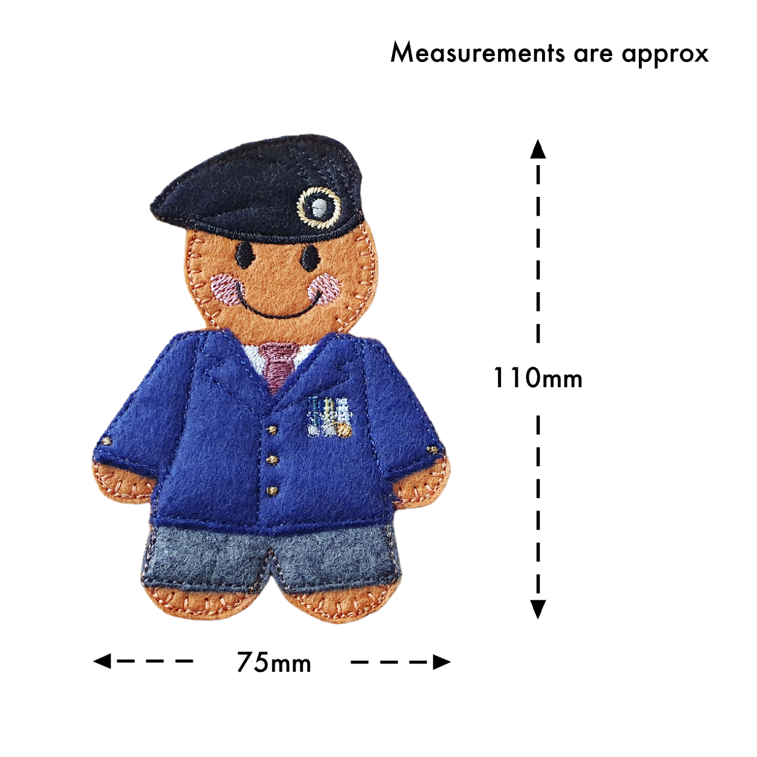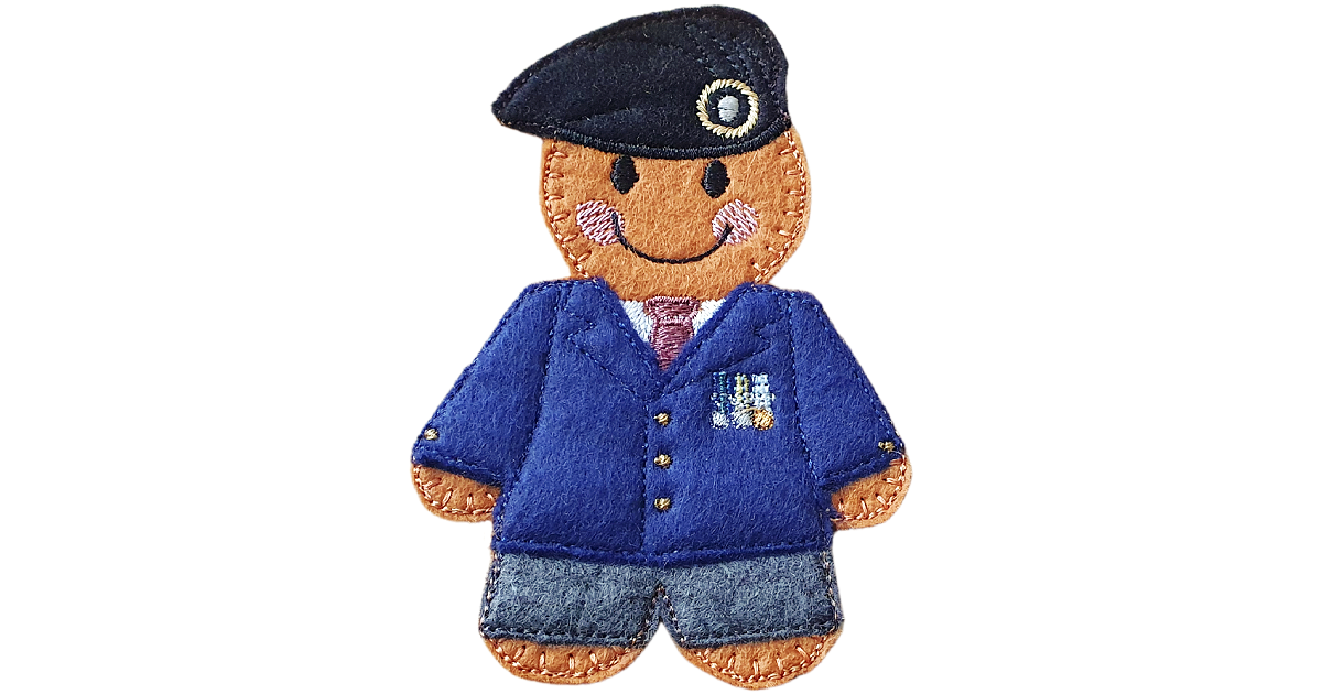 Every detail has been thoughtfully stitched to capture the spirit of service – from the neat uniform and medal accents to the friendly gingerbread smile. The layered design and embroidered details give this character a distinctive presence, making it a touching reminder of bravery and commitment.