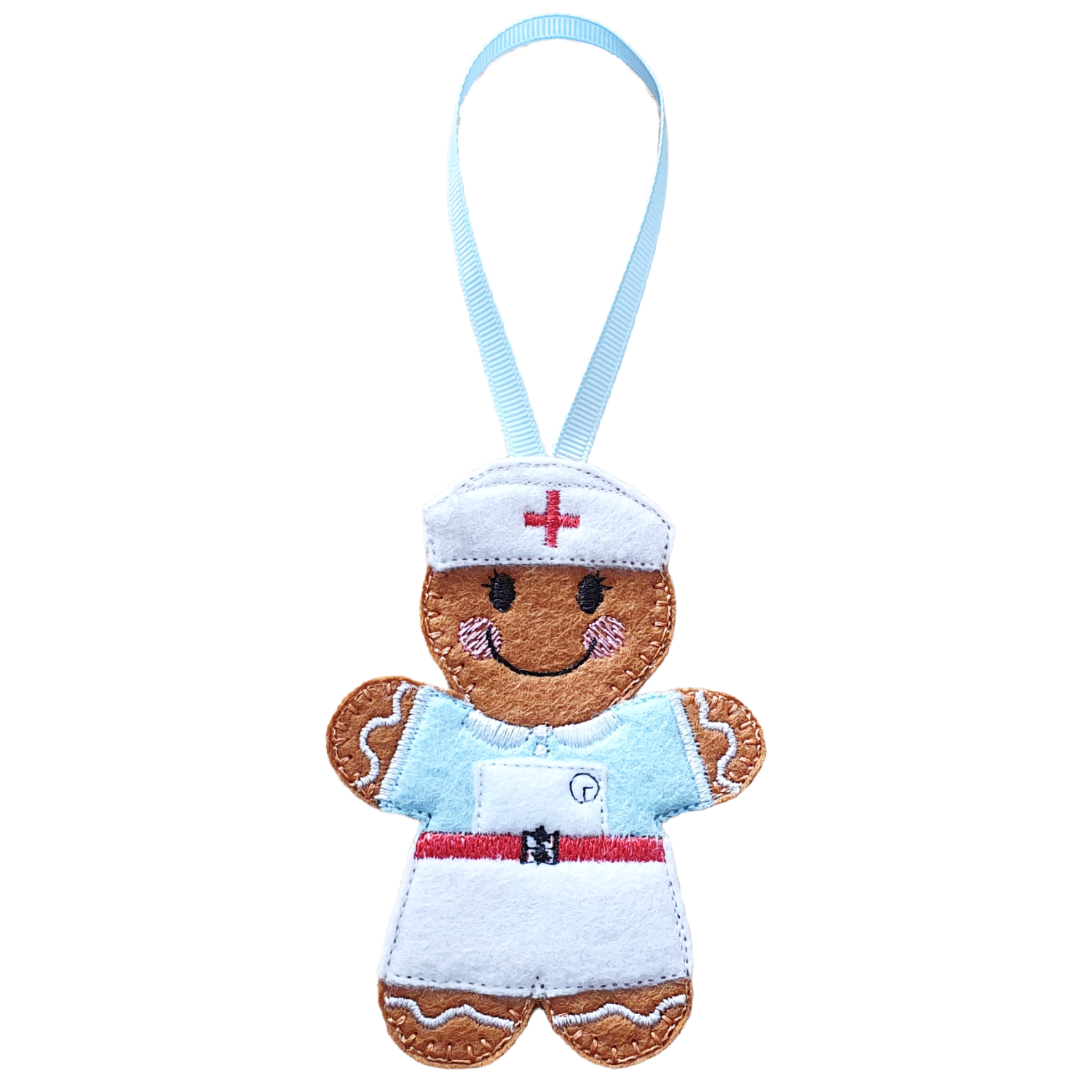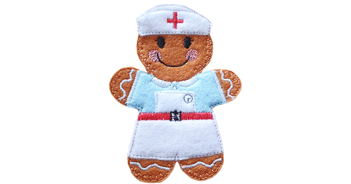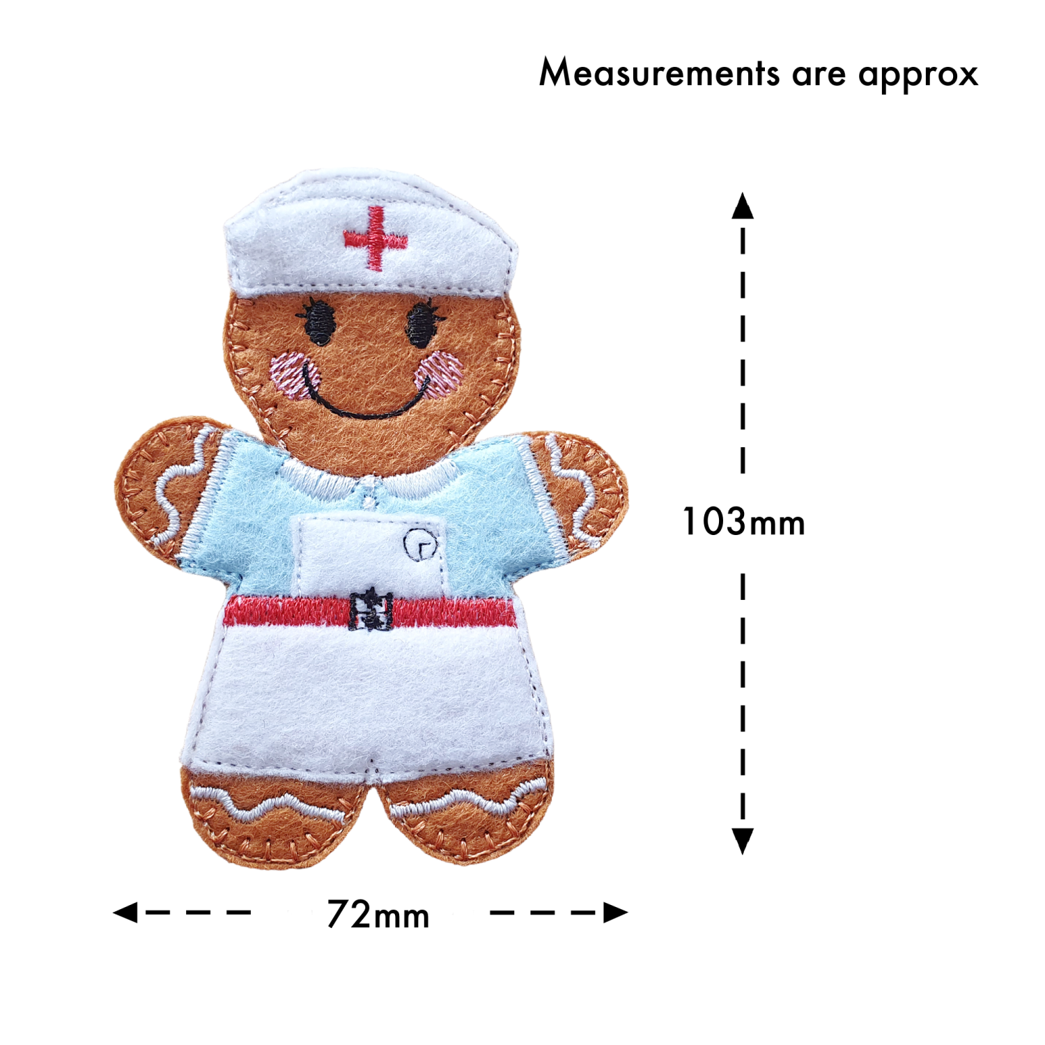 Each gingerbread nurse is carefully made from soft felt and finished with detailed machine embroidery using high-quality threads. From the traditional uniform and stitched apron to the gentle facial features, every element is created with care and attention to detail.