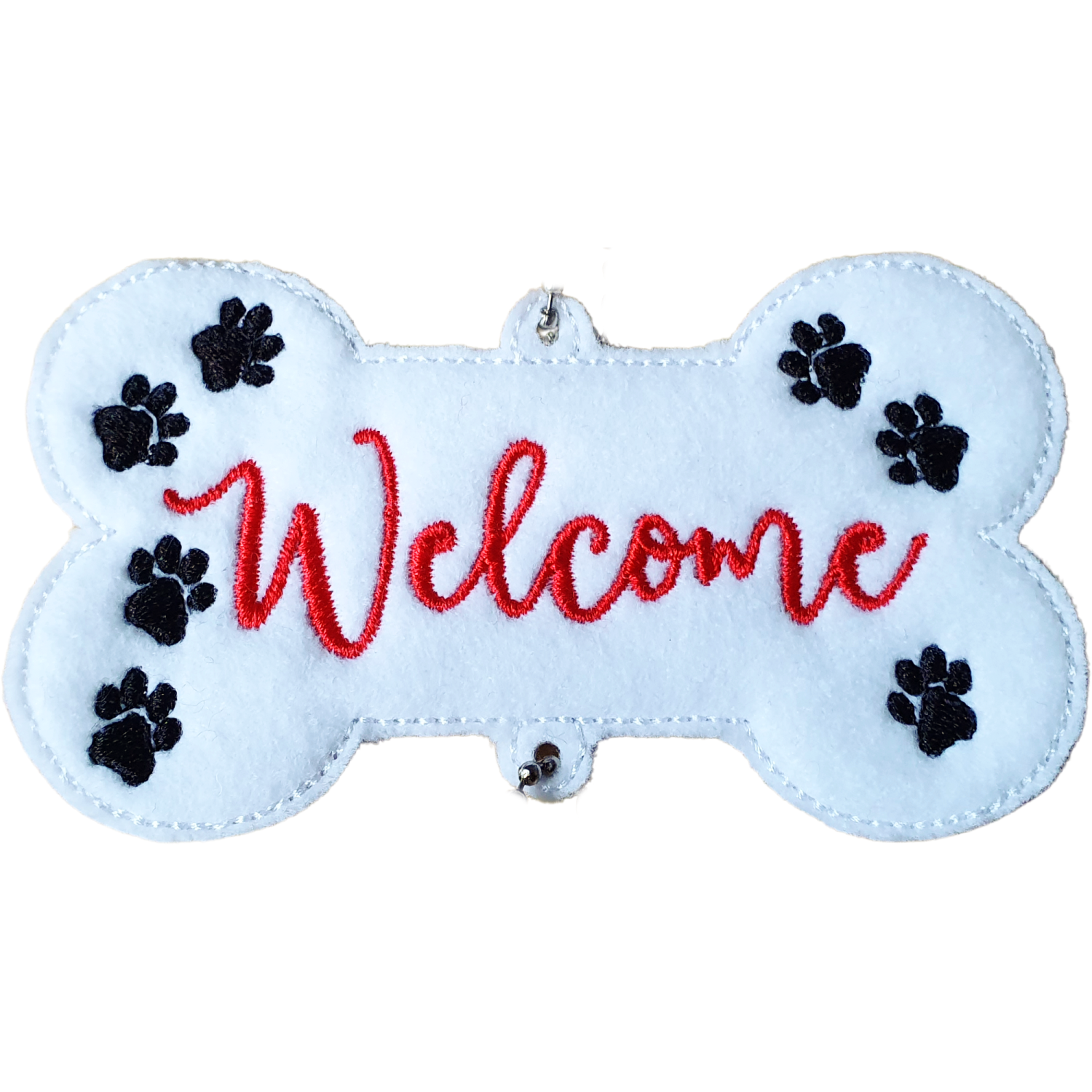 Use the boxes at checkout to choose your colours for each segment. For example, you might opt for a classic white felt backing, a vibrant red for the ‘Welcome’ text, bold black for the bone pawprints, and a playful rainbow mix for the smaller pawprints. Every detail can be tailored to match your personal style or home décor beautifully.