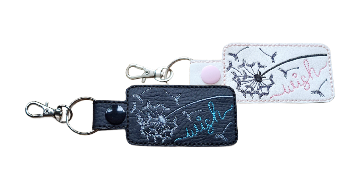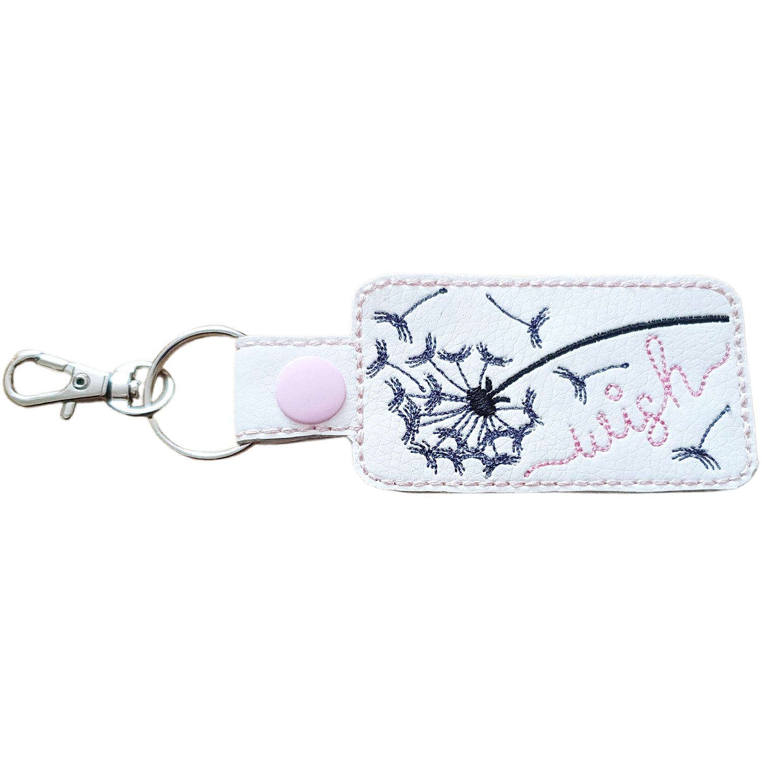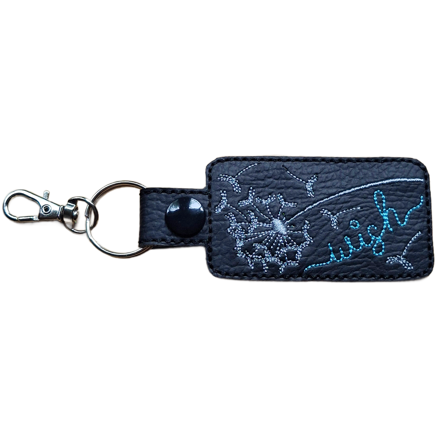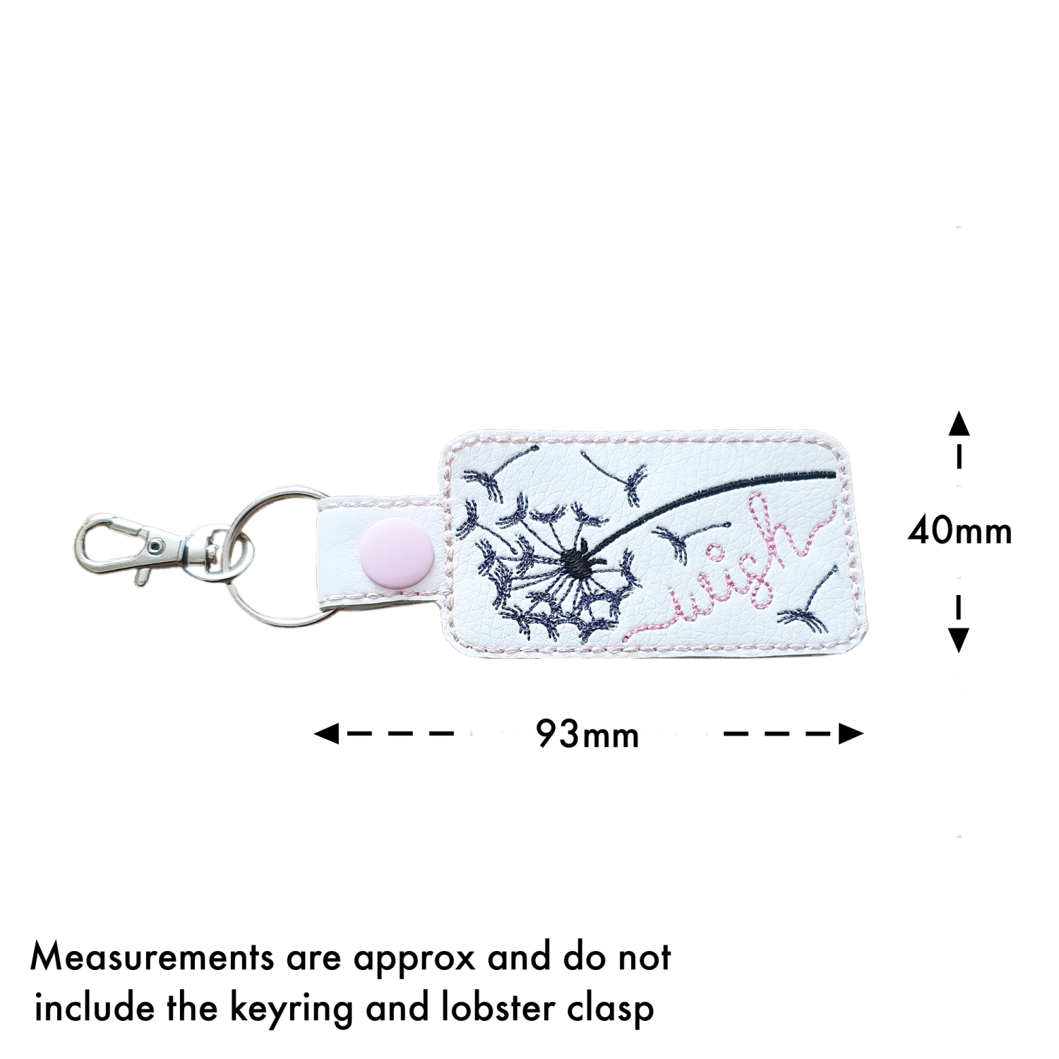 Each keyring is sewn from soft faux leather and embroidered with premium quality threads, bringing the airy dandelion seeds to life as they float across the design. The stitched word wish adds a gentle touch of enchantment, making each keyring feel personal and uplifting.